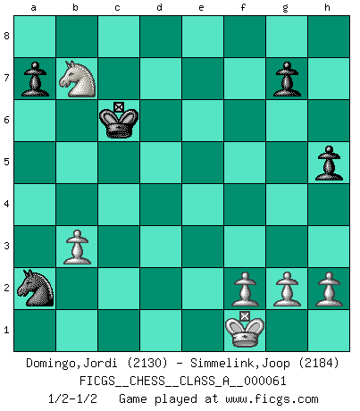 Last move : 1/2-1/2 2010 January 18 18:21:15 [Event "FICGS__CHESS__CLASS_A__000061"] [Site "FICGS"] [Date "2009.12.01"] [Round "1"] [White "Domingo,Jordi"] [Black "Simmelink,Joop"] [Result "1/2-1/2"] [WhiteElo "2130"] [BlackElo "2184"] 1.e4 e5 2.Nf3 Nc6 3.Bc4 Nf6 4.Ng5 d5 5.exd5 Na5 6.Bb5+ c6 7.dxc6 bxc6 8.Bd3 Nd5 9.Nf3 Bd6 10.O-O Nf4 11.Re1 Nxd3 12.cxd3 O-O 13.Nxe5 Re8 14.d4 c5 15.d3 cxd4 16.Nf3 Rxe1+ 17.Qxe1 Ba6 18.Qe4 Bb7 19.Qg4 Rc8 20.Nbd2 h5 21.Qxd4 Nc6 22.Qh4 Qxh4 23.Nxh4 Ne5 24.b3 Nxd3 25.Nc4 Be5 26.Nxe5 Rxc1+ 27.Rxc1 Nxc1 28.Nf5 Nxa2 29.Nxf7 Kxf7 30.Nd6+ Ke6 31.Nxb7 Kd5 32.Kf1 Kc6 33.Nd8+ Kd5 34.Nb7 Kc6 1/2-1/2 Two knights defense Kingside Castling by player White (move 10) Kingside Castling by player Black (move 12) This chess game ended in a draw. Follow this game move after move (download)Botvinnik tried to take the mystery out of Chess, always relating it to situations in ordinary life. He used to call Chess a typical inexact problem similar to those which people are always having to solve in everyday life. (Garry Kasparov) Du weisst es gibt ein Problem mit Computern und Fernschach, wenn jeder eine Rating von 2450 hat. (John Christen Knudsen) Hoy en día, si tu no eres un Gran Maestro a los 14 años, es mejor que lo olvides. (Anand Viswanathan) Le pion, dans sa simplicité, marche droit devant lui, mais lorsqu'il prend, il le fait obliquement? Ainsi l'homme, tant qu'il reste pauvre, marche dans la droiture et vit honnêtement, mais lorsqu'il recherche les honneurs, il flatte, se parjure et, par les voies obliques, cherche une position supérieure sur l'échiquier du monde. (Jean de Galles) All art requires courage. (Anne Tucker)