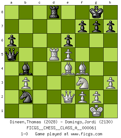 Last move : 1-0 2010 June 9 21:27:58 [Event "FICGS__CHESS__CLASS_A__000061"] [Site "FICGS"] [Date "2009.12.01"] [Round "1"] [White "Dineen,Thomas"] [Black "Domingo,Jordi"] [Result "1-0"] [WhiteElo "2028"] [BlackElo "2130"] 1.d4 d5 2.c4 dxc4 3.Nf3 c5 4.e3 Nf6 5.Bxc4 e6 6.O-O a6 7.Bd3 Nbd7 8.Qe2 b6 9.Nc3 Bb7 10.Rd1 Qb8 11.h3 Be7 12.dxc5 Nxc5 13.Bc2 O-O 14.e4 Rd8 15.Rxd8+ Qxd8 16.Bf4 b5 17.Rd1 Qa5 18.a3 b4 19.e5 Nd5 20.Nxd5 Bxd5 21.Bd2 Nd7 22.Be4 Nb6 23.axb4 Bxb4 24.Be3 Nc4 25.Bf4 Rd8 26.b3 Nb2 27.Rxd5 1-0 This chess game has been lost on time (started : 2009.12.01 2:56:34) QGA : 3.Nf3 Kingside Castling by player White (move 6) Kingside Castling by player Black (move 13) Player White won this chess game. Follow this game move after move (download)Chess is above all, a fight ! (Emanuel Lasker) Man gibt nur Pakete auf. (Paul Keres) No es una movida, aún la mejor movida que tu debas buscar, sino un plan comprensible. (Eugene Znosko-Borovsky) Donnez-moi un Cavalier en 6e et je gagnerais toutes mes parties. (Steinitz) Gambling : The sure way of getting nothing from something. (Wilson Mizner)