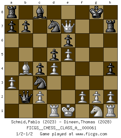 Last move : 1/2-1/2 2010 May 5 22:3:29 [Event "FICGS__CHESS__CLASS_A__000061"] [Site "FICGS"] [Date "2009.12.01"] [Round "1"] [White "Schmid,Pablo"] [Black "Dineen,Thomas"] [Result "1/2-1/2"] [WhiteElo "2023"] [BlackElo "2028"] 1.e4 e6 2.d4 d5 3.Nc3 Nf6 4.Bg5 Bb4 5.e5 h6 6.Be3 Ne4 7.Qg4 Kf8 8.a3 Bxc3+ 9.bxc3 c5 10.Bd3 h5 11.Qf4 g5 12.Qf3 Nxc3 13.Qg3 h4 14.Qg4 c4 15.Bxg5 Qb6 16.Bg6 Qb2 17.Rd1 Ke8 18.Bxf7+ Kxf7 19.Qf4+ Kg8 20.Be7 Nd7 21.Qg5+ Kf7 22.Bb4 Rh7 23.Qe7+ Kg8 1/2-1/2 French : MacCutcheon, Janowski variation This chess game ended in a draw. Follow this game move after move (download)You have to have the fighting spirit. You have to force moves and take chances. (Bobby Fischer) Matt entspricht nicht immer den Tatsachen. (Savielly Grigorievitsch Tartakower) La maestría del Ajedrez consiste esencialmente en analizar posiciónes de Ajedrez con precisión. (Mikhail Botvinnik) Botvinnik disait en comparant les échecs à la musique: Il existe une science dont le but est l'étude de l'acoustique et des sons. Mais il y a aussi un art qui se sert de l'océan des sons : c'est la musique. De toute évidence, il en est de même pour la pensée. La logique est l'étude des lois de la réflexion et les échecs reflètent, en tant qu'art, le côté logique de la réflexion, sous la forme d'images artistiques... Extrait de Fischer - Spassky, Reykjavik 1972 par Alexander & F. Wyndham (Ed. Solar), p 37. All maxims have their antagonist maxims; proverbs should be sold in pairs, a single one being but a half truth. (William Mathews)