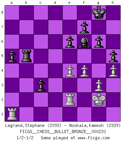 Last move : 1/2-1/2 2010 April 18 18:18:8 [Event "FICGS__CHESS__BULLET_BRONZE__000231"] [Site "FICGS"] [Date "2010.04.18"] [Round "1"] [White "Legrand,Stephane"] [Black "Nookala,Kamesh"] [Result "1/2-1/2"] [WhiteElo "2093"] [BlackElo "2339"] 1.d4 d5 2.c4 c6 3.Nf3 Nf6 4.Nc3 e6 5.e3 Nbd7 6.Qc2 Bd6 7.Be2 O-O 8.O-O dxc4 9.Bxc4 b5 10.Bd3 Bb7 11.Rd1 a6 12.a3 c5 13.Ng5 h6 14.Nge4 Bxe4 15.Nxe4 Nxe4 16.Bxe4 Rc8 17.Qd3 Qb6 18.g3 Rfd8 19.a4 c4 20.Qe2 Qa5 21.Bd2 b4 22.Rdc1 Nb6 23.Be1 Rc7 24.Bg2 Rdc8 25.Bf1 Be7 26.Qg4 h5 27.Qd1 g6 28.Rc2 Kg7 29.h4 Kg8 30.Qc1 Bf8 31.e4 Bg7 32.Qd2 c3 33.bxc3 bxc3 34.Qd3 Rc4 35.Qf3 Bxd4 36.Bxc4 Rxc4 37.Qe2 Qe5 38.Qd3 Qc7 39.a5 Nd7 40.Kg2 Ne5 41.Qd1 Qc5 42.Qe2 Nc6 43.Rb1 Bf6 44.Bd2 Nd4 45.Be3 Nxe2 46.Bxc5 Rxc5 47.Rxe2 Rxa5 48.f4 Rb5 49.Ra1 a5 1/2-1/2 QGD Slav : 4.Nc3 Kingside Castling by player Black (move 7) Kingside Castling by player White (move 8) This chess game ended in a draw. Follow this game move after move (download)The tactician must know what to do whenever something needs doing; the strategist must know what to do when nothing needs doing. (Savielly Tartakover) Fischer machte Schach einfach zu einer aufregenden Sache, wann immer er sich ans Brett setzte. (Raymond Keene) La belleza de un movimiento no se refleja solo en su apariencia, sino en el pensamiento detrás de él. (Siegbert Tarrasch) Soyez une menace à chaque fois que vous vous asseyez pour jouer. (Ken Smith) Winning isn't everything... but losing is nothing. (Mednis)