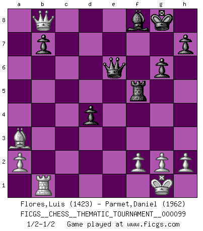 Last move : 1/2-1/2 2010 February 7 21:13:10 [Event "FICGS__CHESS__THEMATIC_TOURNAMENT__000099"] [Site "FICGS"] [Date "2009.12.02"] [Round "1"] [White "Flores,Luis"] [Black "Parmet,Daniel"] [Result "1/2-1/2"] [WhiteElo "1423"] [BlackElo "1962"] 1.d4 Nf6 2.c4 g6 3.Nc3 d5 4.cxd5 Nxd5 5.e4 Nxc3 6.bxc3 Bg7 7.Nf3 c5 8.Bc4 O-O 9.O-O Nc6 10.Be3 cxd4 11.cxd4 Bg4 12.d5 Ne5 13.Rc1 Rc8 14.Be2 Nxf3+ 15.Bxf3 Rxc1 16.Bxc1 Bxf3 17.Qxf3 Qd7 18.Qa3 f5 19.d6 exd6 20.exf5 Rxf5 21.Qxa7 d5 22.Ba3 d4 23.Rb1 Qe6 24.Qb8+ Bf8 1/2-1/2 King's Indian defense, 3.Nc3 Kingside Castling by player Black (move 8) Kingside Castling by player White (move 9) This chess game ended in a draw. Follow this game move after move (download)I'm not afraid of Spassky. The world knows I'm the best. You don't need a match to prove it. (Bobby Fischer) Wenn es im Universum noch irgendwo intelligente Lebewesen gibt, dann kennen sie Go. (Emanuel Lasker) Un entendimiento minucioso de las típicas continuaciones de mate hacen de las mas complicadas combinaciones de sacrificio que conducen hacia ellas no solo no dificiles, sino casi un asunto de rutina. (Siegbert Tarrasch) Une platitude souvent récitée à propos des Echecs est qu'une des choses les plus difficiles à réaliser est de gagner une position gagnante. Cela ne manque pas de sens mais, pour ma part, j'ai toujours trouvé plus difficile de gagner une position perdante. (Tim Krabbe) Is not life a hundred times too short to bore ourselves ? (Friedrich Nietzsche)
