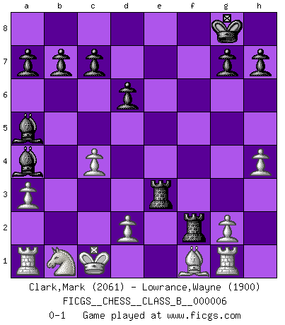 Last move : 0-1 2006 October 29 2:47:52 [Event "FICGS__CHESS__CLASS_B__000006"] [Site "FICGS"] [Date "2006.10.05"] [Round "1"] [White "Clark,Mark"] [Black "Lowrance,Wayne"] [Result "0-1"] [WhiteElo "2061"] [BlackElo "1900"] 1.b4 e5 2.Bb2 Bxb4 3.Bxe5 Nf6 4.c4 Nc6 5.Nf3 Nxe5 6.Nxe5 Ne4 7.Qc2 Nxf2 8.Qf5 Qe7 9.Kxf2 d6 10.Qxf7+ Qxf7+ 11.Nxf7 O-O 12.e3 Rxf7+ 13.Ke1 Bd7 14.a3 Ba5 15.Rg1 Re8 16.Kd1 Ba4+ 17.Kc1 Rf2 18.h4 Rxe3 0-1 Polish (Sokolsky) opening Kingside Castling by player Black (move 11) Player Black won this chess game. Follow this game move after move (download)Strategy requires thought, tactics require observation. (Max Euwe) Im Spitzenschach von heute geht es nur um Vorbereitung, um tiefgründige, sorgfältige Eröffnungsvorbereitung. (Nigel Short) No hay precio que no valga la pena por la cabellera del Rey enemigo. (Koblentz) Les pièces de l'échiquier étaient impitoyables. Elles le retenaient, elles l'absorbaient. Il y avait de l'horreur en cela, mais aussi une harmonie unique. Car, qu'y a-t-il dans le monde, à part les échecs ? (V. Nabokov) The quality of decision is like the well-timed swoop of a falcon which enables it to strike and destroy its victim. (Sun Tzu)