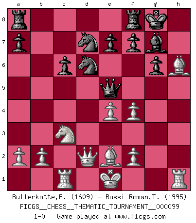 Last move : 1-0 2010 February 27 4:52:28 [Event "FICGS__CHESS__THEMATIC_TOURNAMENT__000099"] [Site "FICGS"] [Date "2009.12.02"] [Round "1"] [White "Bullerkotte,Frank"] [Black "Russi Roman,Tano-Urayoan"] [Result "1-0"] [WhiteElo "1609"] [BlackElo "1995"] 1.d4 Nf6 2.c4 g6 3.Nc3 d5 4.cxd5 Nxd5 5.Na4 Nb6 6.e4 Nc6 7.Be3 Bg7 8.Nf3 O-O 9.Be2 Bg4 10.d5 Bxf3 11.gxf3 Ne5 12.Rc1 Ned7 13.Nc3 Nc8 14.h4 Nd6 15.h5 c6 16.dxc6 bxc6 17.hxg6 hxg6 18.Qd2 Qa5 19.Bh6 Qe5 20.f4 1-0 King's Indian defense, 3.Nc3 Kingside Castling by player Black (move 8) Player White won this chess game. Follow this game move after move (download)When you don't know what to play, wait for an idea to come into your opponent's mind. You may be sure that idea will be wrong. (Siegbert Tarrasch) Ich hatte Angst gegen einen russischen Großmeister zu verlieren, und er befürchtete gegen einen kleinen Jungen zu verlieren. (über ein Remis gegen Juri Awerbach). (Robert James Fischer) Hasta este punto, las blancas han seguido un análisis bien conocido. Pero ahora el hace un error fatal: empieza a usar su propia cabeza. (Siegbert Tarrasch) Il n'y a pas de prix trop élevé au scalp de l'ennemi. (Koblentz) Art disturbs, science reassures. (Georges Braque, Le Jour et la Nuit)