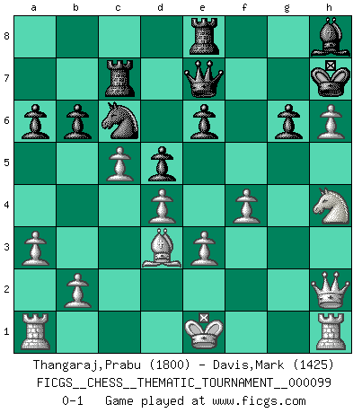 Last move : 0-1 2010 March 6 21:37:49 [Event "FICGS__CHESS__THEMATIC_TOURNAMENT__000099"] [Site "FICGS"] [Date "2009.12.02"] [Round "1"] [White "Thangaraj,Prabu"] [Black "Davis,Mark"] [Result "0-1"] [WhiteElo "1800"] [BlackElo "1425"] 1.d4 Nf6 2.c4 g6 3.Nc3 d5 4.c5 Bg7 5.Bf4 O-O 6.h3 Nc6 7.e3 e6 8.g4 a6 9.h4 Bd7 10.h5 Ne4 11.Nf3 Qe7 12.Bxc7 Rac8 13.Nxe4 Rxc7 14.Nd6 Rd8 15.hxg6 fxg6 16.Qc2 Rf8 17.Nh4 Qf6 18.f4 Nb4 19.Qh2 h6 20.Nf3 b6 21.a3 Nc6 22.g5 Qe7 23.Nh4 Kh7 24.Bd3 Be8 25.gxh6 Bh8 26.Nxe8 Rxe8 0-1 King's Indian defense, 3.Nc3 Kingside Castling by player Black (move 5) Player Black won this chess game. Follow this game move after move (download)I thought the most common mistake [in chess] was the first one: Learning the game :P (Garvin Gray, FICGS forum) Wie, soll nun auch die Opposition abgeschafft werden? Ja, es tut mir leid, Ihnen diesen Schmerz nicht ersparen zu können. (Aaron Nimzowitsch) Cuando tu casa esta en llamas, no puedes ser molestado por tus vecinos. O, como decinos en Ajedrez, si tu Rey esta bajo ataque, no te preocupa perder un Peón del lado de la Reina. (Gary Kasparov) A chaque perte on perd un peu de soi. (Joël Lautier) Man is still the most extraordinary computer of all. (John F. Kennedy)