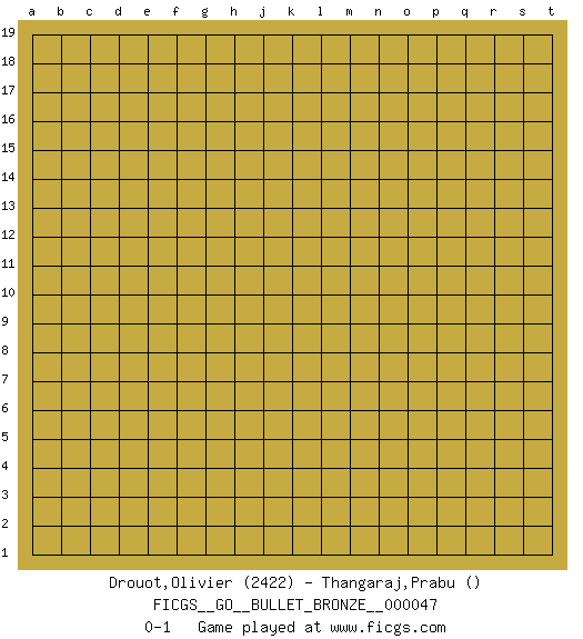 Last move : 0-1 2009 December 2 13:28:54 [Event "FICGS__GO__BULLET_BRONZE__000047"] [Site "FICGS"] [Date "2009.12.02"] [Round "1"] [Black "Drouot,Olivier"] [White "Thangaraj,Prabu"] [Result "0-1"] [Rating 1 "2422"] 0-1 This go game has been lost on time (started : 2009.12.02 10:38:1) Here are the names of the openings (joseki) played in the four corners : Player White won this Go (weiqi, baduk) game. Follow this game move after move (download)In an unreasonable situation, an unreasonable move is reasonable. (Tamino) When I took office, only high energy physicists had ever heard of what is called the World Wide Web... Now even my cat has its own page. (Bill Clinton, 1996)