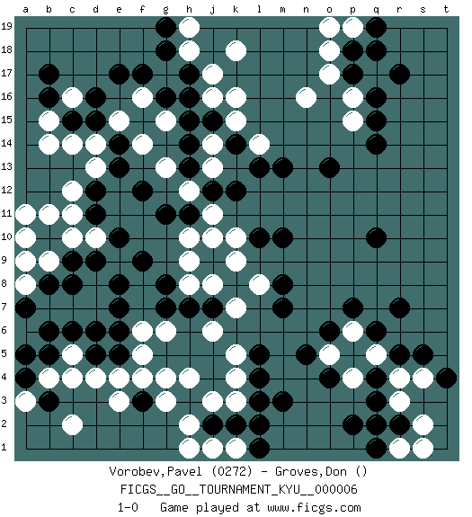 Last move : 1-0 2006 November 2 7:36:43 [Event "FICGS__GO__TOURNAMENT_KYU__000006"] [Site "FICGS"] [Date "2006.10.07"] [Round "1"] [Black "Vorobev,Pavel"] [White "Groves,Don"] [Result "1-0"] [Rating 1 "0272"] 1.q16 d4 2.q4 c16 3.q10 d10 4.e17 k4 5.d15 k16 6.c15 d13 7.f3 e3 8.b16 f4 9.c6 c5 10.b5 b4 11.d5 c4 12.e5 e4 13.h17 n16 14.q14 j17 15.h16 o17 16.m3 h4 17.e8 d8 18.e7 e9 19.b8 c7 20.b6 b7 21.a7 d7 22.d6 b9 23.g7 f5 24.g8 f6 25.c9 c10 26.e6 g4 27.b10 b11 28.a9 a11 29.d9 a10 30.e10 b9 31.f9 a8 32.c8 a9 33.p18 o18 34.p17 h18 35.d12 c12 36.d11 c11 37.f12 c14 38.o4 k7 39.r7 g3 40.r5 f14 41.g18 h19 42.g19 k18 43.o13 j14 44.k2 j3 45.m7 g6 46.m13 l14 47.l10 j6 48.e13 d14 49.e14 b14 50.l5 k5 51.h14 p16 52.r17 p15 53.q15 p19 54.q19 o19 55.q18 g13 56.h13 h12 57.j12 j11 58.k12 k10 59.j9 k9 60.h11 h10 61.g11 j10 62.j2 h2 63.j15 k15 64.a4 a3 65.a5 g15 66.h15 g17 67.g16 l8 68.m10 h9 69.b3 c2 70.h7 h8 71.j7 j8 72.m8 b15 73.b17 e15 74.d16 f16 75.f17 j13 76.l4 k3 77.l3 j1 78.l1 h1 79.l13 k1 80.l2 r3 81.q3 s4 82.s5 q2 83.p2 s2 84.q1 r1 85.r2 s1 86.q2 r4 87.t4 p6 88.p7 q5 89.q6 o5 90.o6 p4 91.n5 j16 92.k14 1-0 Here are the names of the openings (joseki) played in the four corners : Corner d16 : c16 e17 Komoku (Somok, Xiao~mu`) 3-4 Point. The komoku (3-4) point is the traditional corner enclosure move.. Ikken Kakari (Hankan Keolch'im, Yi Gua`jiao~, 1-Space Low Pincer). The small knight move is the basic approach move to the 3-4 point stone. It has been continually used for over four centuries. There are limitless variations, with new moves constantly being discovered. Black 2 opens the door to a treaure store of joseki. Corner d4 : d4 f3 Hoshi (Hwajeom, Seongjeom, Xingwei`) 4-4 Point. The star or hoshi (4-4) point, emphasizing influence at the potential expense of territory. Ikken Kakari (Hankan Keolch'im, Yi Gua`jiao~, 1-Space Low Approach). Black 2 is the standard approach move to the 4-4. Corner q16 : q16 n16 Hoshi (Hwajeom, Seongjeom, Xingwei`) 4-4 Point. The star or hoshi (4-4) point, emphasizing influence at the potential expense of territory. Nikken Takagakari (Dukan Nop'dakeolch'im, E`r Gaojia, 2-Space High Approach). White 2 is a light approach move. Rarely played in even games, White 2 is typically employed in handicap games. Black continues with 6-4 or 3-10. In Korean Sunjang Baduk Black has a stone on 8-4. Player Black won this Go (weiqi, baduk) game. Follow this game move after move (download)Don't try to enclose an open skirt. (Anonymous) You cannot beat a roulette table unless you steal money from it. (Albert Einstein)
