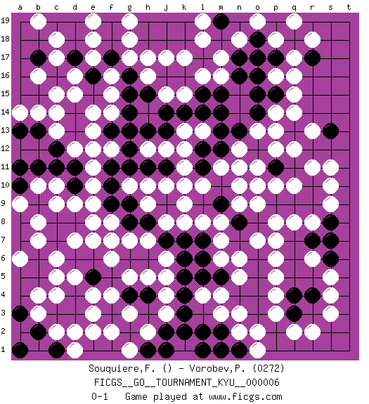 Last move : 0-1 2006 December 28 21:24:6 [Event "FICGS__GO__TOURNAMENT_KYU__000006"] [Site "FICGS"] [Date "2006.10.07"] [Round "1"] [Black "Souquiere,Florence"] [White "Vorobev,Pavel"] [Result "0-1"] [Rating 2 "0272"] 1.d4 q16 2.r7 c17 3.k4 c6 4.q11 c9 5.o6 m3 6.m5 p3 7.j2 r13 8.r4 s11 9.f17 c14 10.f3 b4 11.d6 r2 12.c7 c5 13.f5 b7 14.k16 m17 15.c3 e9 16.g8 h16 17.j11 k17 18.n13 f15 19.j14 n15 20.m15 d7 21.d8 e7 22.c8 b8 23.m9 n14 24.m14 o13 25.o12 g18 26.j16 j17 27.g14 f14 28.f13 n12 29.m13 o11 30.p12 n11 31.m12 m11 32.l11 p10 33.o14 p13 34.q13 p14 35.o15 q14 36.n16 n18 37.e8 f8 38.j9 p5 39.f7 d9 40.p9 q8 41.o10 q10 42.q9 n10 43.p11 o9 44.r10 o10 45.o8 p8 46.r9 r11 47.s13 p7 48.n9 q12 49.m10 r8 50.s8 e13 51.k7 p6 52.f11 f12 53.g13 e11 54.g12 e12 55.g11 o7 56.n8 n6 57.o5 n5 58.o4 n3 59.o3 o2 60.n4 m4 61.g16 f16 62.g15 g17 63.h15 h17 64.e16 e17 65.f18 e18 66.f19 g19 67.l2 s3 68.m2 p18 69.f10 e10 70.f9 e8 71.e6 m6 72.l5 b3 73.b2 s5 74.p15 q15 75.e15 e14 76.n7 g7 77.g6 f6 78.q4 p4 79.f7 h7 80.o12 p12 81.l6 f6 82.j7 f7 83.g9 g5 84.d17 e4 85.d18 e19 86.b5 f4 87.e5 d5 88.g4 e3 89.p11 h5 90.a4 c4 91.e5 g3 92.l17 l18 93.g2 f2 94.o17 h2 95.d16 l16 96.c16 c18 97.d19 b16 98.l15 c15 99.h4 j3 100.k3 j4 101.c12 c2 102.h6 j6 103.k6 j5 104.f17 m7 105.h8 s10 106.r17 r18 107.q18 q17 108.o18 o19 109.p19 q19 110.b17 d15 111.c19 b19 112.h1 g1 113.j1 l8 114.m8 m16 115.l7 l10 116.e16 k10 117.b6 k11 118.a3 k12 119.l12 j10 120.b11 h10 121.l9 k9 122.k2 k13 123.d3 d2 124.h11 j12 125.j13 k15 126.k14 j15 127.l14 k8 128.n17 j8 129.q3 h9 130.h13 h12 131.p17 p16 132.o16 q2 133.d11 l13 134.k5 g10 135.n1 n2 136.m1 o1 137.l1 l4 138.d10 b10 139.b13 d12 140.c11 b14 141.m9 m8 142.n8 n9 143.e1 d1 144.a1 a6 145.c1 c13 146.a5 a2 147.a3 s9 148.f1 e2 149.a10 a9 150.a11 a14 151.a13 c10 152.m19 l19 153.s7 r6 154.s6 s4 155.d17 d16 0-1 Here are the names of the openings (joseki) played in the four corners : Corner d4 : d4 c6 Hoshi (Hwajeom, Seongjeom, Xingwei`) 4-4 Point. The star or hoshi (4-4) point, emphasizing influence at the potential expense of territory. Ikken Kakari (Hankan Keolch'im, Yi Gua`jiao~, 1-Space Low Approach). White 2 is the standard approach move to the 4-4. Corner q16 : q16 q11 Hoshi (Hwajeom, Seongjeom, Xingwei`) 4-4 Point. The star or hoshi (4-4) point, emphasizing influence at the potential expense of territory. Corner d16 : c17 f17 San-San (Sam-Sam, San-San) 3-3 Point. The San-San (3-3) point, emphasizing territory at the expense of influence. Nikken Kakari (Dukan Keolch'im, E`r Gua`jiao~, 2-Space Low Approach). White can thwart Black's strategy with a play at 9-4. Player White won this Go (weiqi, baduk) game. Follow this game move after move (download)Win the early ko to win the game. (Anonymous) We're missing something. (Gregory House, House M.D.)