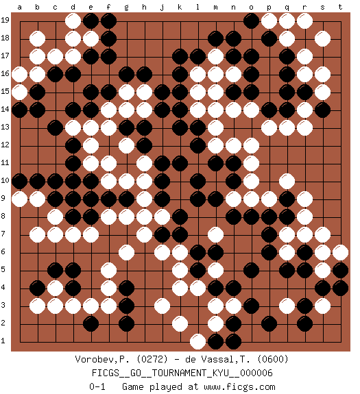 Last move : 0-1 2007 March 26 11:48:5 [Event "FICGS__GO__TOURNAMENT_KYU__000006"] [Site "FICGS"] [Date "2006.10.07"] [Round "1"] [Black "Vorobev,Pavel"] [White "de Vassal,Thibault"] [Result "0-1"] [Rating 1 "0272"] [Rating 2 "0600"] 1.q16 q3 2.d16 c4 3.q5 q7 4.o3 e3 5.c10 c7 6.c13 m3 7.r5 j3 8.o5 q10 9.k17 q13 10.o16 s3 11.r2 m7 12.r3 m13 13.k13 l11 14.j11 l14 15.k14 l16 16.k16 r17 17.q17 r16 18.r15 s15 19.r18 r14 20.q15 o14 21.s14 s16 22.f9 s18 23.m18 c17 24.c16 d17 25.e17 e18 26.f17 b17 27.f18 d19 28.g4 g6 29.m4 l4 30.l5 m5 31.n4 k4 32.m6 a15 33.b14 s6 34.p7 r7 35.s4 k5 36.l6 e7 37.j7 j6 38.l9 m10 39.m9 n9 40.n10 o9 41.n8 q18 42.p18 r19 43.p8 p9 44.q8 r8 45.b4 b3 46.k7 g10 47.g9 g12 48.n2 m2 49.q9 r9 50.n11 o12 51.m11 o11 52.l12 n16 53.n17 m17 54.l17 m16 55.n18 b9 56.c9 c8 57.b10 a9 58.a10 b7 59.a14 b16 60.b15 a16 61.o15 f10 62.e10 e11 63.d11 e12 64.n15 f14 65.h13 d13 66.d14 e9 67.d10 g8 68.e8 h9 69.d9 f8 70.e9 h11 71.h8 h7 72.g13 f13 73.j10 f11 74.e15 g15 75.f15 g14 76.g16 h15 77.h12 h10 78.d12 e13 79.m1 l1 80.n1 l15 81.g2 k2 82.p14 p13 83.d4 d3 84.o8 o10 85.c5 c3 86.d8 d7 87.d5 f5 88.q14 r13 89.k15 n14 90.l13 m14 91.e2 f3 92.g3 f4 93.f19 b18 94.j9 n3 95.p2 s5 96.t5 t6 97.t4 q6 98.r6 s7 99.p6 m12 100.l10 n12 101.k11 j8 102.k8 h8 103.h16 p19 104.o19 q19 105.j15 h14 106.j14 m15 107.o17 k6 108.e19 d18 109.e14 pass 110.pass pass 0-1 Here are the names of the openings (joseki) played in the four corners : Corner q4 : q3 q5 Komoku (Somok, Xiao~mu`) 3-4 Point. The komoku (3-4) point is the traditional corner enclosure move.. Ikken Takagakari (Hankan Nop'dakeolch'im, Yi Gaogua`jiao~, 1-Space High Approach). The 5-4 approach move has become more popular in modern times, as modern Go emphasizes speed and influence. Corner q16 : q16 q13 Hoshi (Hwajeom, Seongjeom, Xingwei`) 4-4 Point. The star or hoshi (4-4) point, emphasizing influence at the potential expense of territory. Nikken Takagakari (Dukan Nop'dakeolch'im, E`r Gaojia, 2-Space High Approach). White 2 is a light approach move. Rarely played in even games, White 2 is typically employed in handicap games. Black continues with 6-4 or 3-10. In Korean Sunjang Baduk Black has a stone on 8-4. Player White won this Go (weiqi, baduk) game. Follow this game move after move (download)Go is essentially a form of harmony. Go in the 21st century will have to be go of the 'harmony of the six points - the four quarters, the above and the below.' As in life we will need to view the whole rather than the part. Japanese go has focused too heavily on the local (joseki) rather than the whole for 300 years. The reason the Chinese and Koreans are overtaking the Japanese is that they are closer to achieve this whole-board view. (Go Seigen, 9p, 1994) Lottery : A tax on people who are bad at math. (Author unknown)