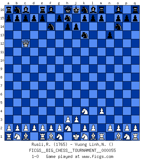 Last move : 1-0 2010 January 21 20:22:48 [Event "FICGS__BIG_CHESS__TOURNAMENT__000055"] [Site "FICGS"] [Date "2009.12.03"] [Round "1"] [White "Rusli,Rafnizar"] [Black "Vuong Linh,Nguyen"] [Result "1-0"] [WhiteElo "1765"] [BlackElo ""] 1.j2-k4 j15-k13 2.h1-o7 p16-o14 3.m2-m4 n15-n13 4.o7-f15 g16-f14 5.f15-c12 1-0 This big chess game has been lost on time (started : 2009.12.03 21:42:2) Follow this game move after move (download)A bad plan is better than none at all. (Frank Marshall) Gegen einen Schachcomputer zu verlieren ist wie Löcher in den Strümpfen zuhaben. Es ist nicht peinlich, solange man der einzige ist der es weiß. (Anonymous) Diferente gente reacciona diferentemente en aceptar la derrota. (Bobby Fischer) Les Echecs sont et restent toujours un combat, un combat intégral comme la boxe, la lutte ou un autre sport, et où il doit y avoir un vainqueur et un vaincu. (Joseph Emil Diemer) May I never be complete. May I never be content. May I never be perfect. Deliver me, Tyler, from being perfect and complete. (Chuck Palahniuk, Fight Club)