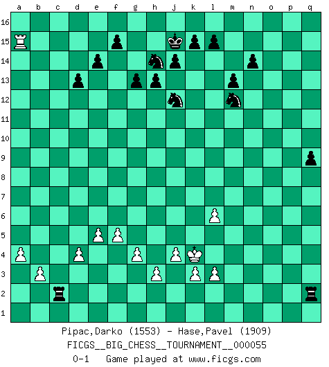 Last move : 0-1 2010 March 25 9:50:25 [Event "FICGS__BIG_CHESS__TOURNAMENT__000055"] [Site "FICGS"] [Date "2009.12.03"] [Round "1"] [White "Pipac,Darko"] [Black "Hase,Pavel"] [Result "0-1"] [WhiteElo "1553"] [BlackElo "1909"] 1.j2-k4 p16-o14 2.b2-b3 n15-n14 3.c1-b2 d15-d14 4.p2-p3 j15-k13 5.h1-o7 c16-e14 6.b2-o14 p15-o14 7.o7-o14 o16-k12 8.o14-o3 h15-f14 9.o3-o4 h16-p9 10.o2-o3 g15-g14 11.o4-o15 p9-m12 12.b1-c3 e14-l8 13.o15-o6 b16-d15 14.n2-n4 h14-h13 15.m2-m4 k12-m10 16.e2-e3 f16-l11 17.g1-e2 m16-o16 18.o6-l6 l8-f13 19.l6-b15 f13-e12 20.b15-c15 l11-g7 21.c15-c12 d14-d13 22.c12-c6 e16-c16 23.c6-g6 m15-m13 24.o1-q3 e15-e14 25.l1-q6 m10-h6 26.l2-l3 e12-c10 27.g6-g4 c10-m1 28.h2-j4 h6-l9 29.g4-j6 m1-k3 30.e2-d4 o16-o6 31.j6-q13 m12-n13 32.q13-n13 g7-n13 33.q6-p5 o6-o9 34.p5-l9 o9-l9 35.f1-c4 k3-q9 36.p1-n2 q16-o16 37.o3-o4 q9-l4 38.q3-p4 l16-m15 39.j4-k6 l4-e10 40.k6-j8 l9-p9 41.p4-o3 k13-l11 42.j8-k10 m15-k13 43.c4-b5 k13-b5 44.c3-b5 k16-l14 45.k10-m11 n13-m14 46.q2-q4 g16-h14 47.q4-q5 h14-j12 48.q1-q4 o16-o11 49.m4-m5 o11-m11 50.n2-m4 p9-p3 51.j1-h2 j16-j15 52.j3-j4 c16-p16 53.k1-j3 p16-p15 54.q5-q6 m14-g9 55.j3-k5 l14-m12 56.b5-c7 g9-d6 57.g2-g3 d6-c7 58.d4-e6 c7-f10 59.e6-f8 e10-a14 60.o3-q5 f10-h12 61.q4-q1 l11-m9 62.q1-p1 a16-p16 63.p1-p3 p15-p3 64.m4-o5 p3-q3 65.e1-q1 q3-q1 66.a1-q1 m9-n7 67.o5-m6 m11-f11 68.f8-g10 h12-k10 69.f2-f4 d15-e13 70.k4-l6 n7-l6 71.m5-l6 e13-c12 72.m6-l8 k10-g7 73.l8-j9 c12-e11 74.g10-h12 f11-p11 75.j9-g10 e11-g10 76.h12-g10 g14-g13 77.k5-j7 p11-g11 78.j7-h9 g11-g10 79.h9-g7 g10-g7 80.a2-a4 p16-p2 81.q1-k1 g7-q7 82.q5-o3 p2-p3 83.o3-q5 q7-q6 84.q5-o7 q6-q2 85.h2-j3 p3-n3 86.o7-m5 a14-m3 87.k1-p1 m3-n4 88.m5-n4 n3-n4 89.p1-p16 n4-o4 90.p16-a16 f14-g12 91.a16-a15 g12-h14 92.d2-d4 o4-o2 93.k2-k3 o2-c2 94.e3-e4 q15-q13 95.j3-k4 q13-q12 96.g3-g4 q12-q11 97.f4-f5 q11-q10 98.e4-e5 q10-q9 0-1 Follow this game move after move (download)Daring ideas are like Chess men moved forward. They may be beaten, but they may start a winning game. (Johann Wolfgang von Goethe) Taktik ist was man tun muß, wenn etwas zu tun ist. Strategie ist was man tun muß, wenn nichts zu tun ist. (Savielly Grigorievitsch Tartakower) ¿Cual es el objetivo de jugar una apertura de gambito?... Para adquirir una reputación de ser un jugador apuesto a costo de perder el juego. (Siegbert Tarrasch) Les sacrifices démontrent seulement que quelqu'un a gaffé. (Savielly Tartacover) Life is like internet, nothing interesting, but noone want to leave it. (Ilmars Cirulis)