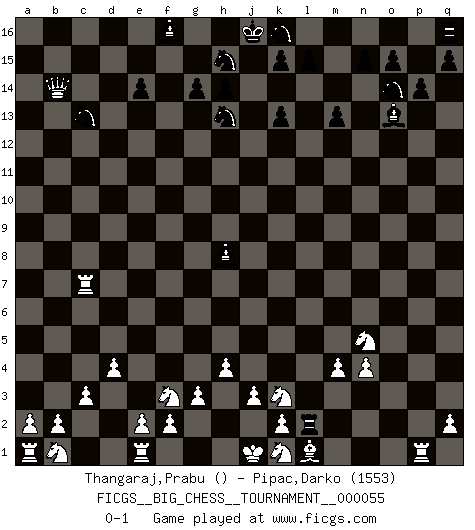 Last move : 0-1 2010 March 1 9:34:51 [Event "FICGS__BIG_CHESS__TOURNAMENT__000055"] [Site "FICGS"] [Date "2009.12.03"] [Round "1"] [White "Thangaraj,Prabu"] [Black "Pipac,Darko"] [Result "0-1"] [WhiteElo ""] [BlackElo "1553"] 1.d2-d4 p15-p14 2.j2-k4 o16-p15 3.g1-f3 g15-g14 4.m2-m4 j15-k13 5.n2-n4 h16-o10 6.g2-g3 o10-o2 7.p1-o3 p15-h8 8.h1-l4 b15-b14 9.h2-k3 c16-a14 10.l4-l6 a14-o1 11.q1-o1 o2-p2 12.l6-a16 p2-p11 13.a16-j8 p11-l11 14.c2-c3 e15-e14 15.h3-h4 p16-o14 16.c1-k8 l11-l2 17.k4-l2 h8-l11 18.f1-o9 g16-j15 19.k8-c15 e16-c16 20.j8-b15 c16-c15 21.b15-c15 b16-a14 22.c15-d15 m15-m13 23.d15-f15 m16-m14 24.f15-a15 a14-c13 25.o3-n5 l16-o13 26.a15-b14 m14-l14 27.o1-o7 j15-h13 28.o7-c7 l11-h8 29.m1-p1 l14-l2 30.o9-k13 j14-k13 0-1 Follow this game move after move (download)I know people who have all the will in the world, but still can't play good Chess. (Bobby Fischer) Ich war zu klein für die Schach-Schülermannschaft! (Woody Allen) Sin errores no puede haber brillantez. (Emanuel Lasker) Votre prénom est 'Tactique', votre deuxième prénom est 'Tactique' et votre nom est 'Tactique'. (Ken Smith) God, you are such an idiot. - Actually, I thought I was more of a jerk. (Gregory House to Stacy Warner, House M.D.)