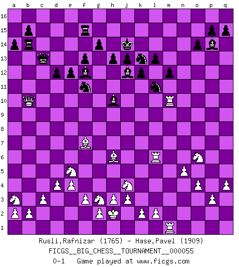 Last move : 0-1 2010 July 12 9:25:19 [Event "FICGS__BIG_CHESS__TOURNAMENT__000055"] [Site "FICGS"] [Date "2009.12.03"] [Round "1"] [White "Rusli,Rafnizar"] [Black "Hase,Pavel"] [Result "0-1"] [WhiteElo "1765"] [BlackElo "1909"] 1.j2-k4 p16-o14 2.h1-o7 h15-g13 3.o7-c7 j15-k13 4.m2-m4 b16-c14 5.h2-g4 h16-o10 6.e2-e4 n15-n13 7.d2-d4 o16-j11 8.n2-n4 e15-e13 9.o2-o3 f16-b12 10.o1-b13 a15-a14 11.b13-j6 m15-m13 12.j6-k7 o10-p9 13.p2-p3 k16-h15 14.c7-b6 g16-f14 15.k4-m5 d15-d13 16.f1-b5 c16-g12 17.p1-n2 l16-o13 18.b6-b11 j11-h10 19.b1-a3 e13-e12 20.k1-l3 g13-f11 21.b11-b10 h10-e13 22.b10-b6 h15-j13 23.k7-g10 k13-j11 24.g10-j12 f14-h13 25.c1-g5 m13-m12 26.g5-e7 g15-g14 27.b6-o6 o13-l10 28.e7-j11 h13-j11 29.o6-j11 l10-p14 30.j11-l13 l15-l14 31.l13-n13 q16-n16 32.n13-o12 j16-j15 33.l1-q6 j13-l12 34.j12-k11 l12-n13 35.o12-m10 b12-f16 36.g1-j2 h14-h13 37.m10-h6 f11-h10 38.k11-d5 h10-j8 39.h6-l6 f15-f13 40.q6-o4 k15-k13 41.b5-g10 j8-k10 42.j2-g3 j14-j13 43.l6-b6 a16-b16 44.o4-q6 n13-l12 45.o3-o4 n16-n4 46.l3-n4 m16-n16 47.n2-l3 j15-j14 48.n4-l5 f16-e15 49.d5-l12 k10-l12 50.q1-n1 p9-q10 51.g10-h9 e15-h12 52.b6-j6 g12-e10 53.j6-e6 e10-f9 54.q2-q4 f9-j12 55.j1-h2 l12-m14 56.n1-n5 n16-n5 57.m4-n5 q10-l5 58.m5-k4 l14-l13 59.m1-m5 l5-f10 60.e6-d6 k13-k12 61.e1-m1 f10-b10 62.a1-b1 b10-c9 63.h9-d5 d13-d12 64.f2-f3 e16-n16 65.c2-c3 n16-n15 66.q6-m10 h12-c7 67.d6-b4 e13-l7 68.l3-j4 c9-a9 69.g4-e5 c14-e13 70.m5-l5 c7-g11 71.k4-m5 l7-h10 72.b4-b3 o14-n12 73.m10-g5 n12-l11 74.m5-o6 c15-c13 75.m1-m2 c13-c12 76.b1-m1 b16-c16 77.m2-m7 c16-c14 78.m7-m10 a9-a13 79.b3-b8 g11-f12 80.b8-h8 e13-f11 81.h8-g8 c14-b14 82.d5-b3 o15-o14 83.g8-c12 n15-g15 84.l5-l8 m14-k13 85.g5-h6 a13-e13 86.l8-l6 b14-c14 87.c12-b12 g15-f15 88.b3-f7 e13-c13 89.b12-b10 c14-b14 0-1 This big chess game has been lost on time (started : 2009.12.03 21:42:2) Follow this game move after move (download)The chessboard is the world, the pieces are the phenomena of the Universe, the rules of the game are what we call the laws of Nature and the player on the other side is hidden from us. (Thomas Huxley) Der Umstand, daß uns eine 7 Stunden Zeitkontrolle ermöglicht eine großartige, tiefe Partie zu spielen, ist für die Massenmedien nicht weiter von Bedeutung. (Alexej Shirov) Prefiero perder una partida realmente buena, que ganar una mala. (David Levy) Le jeu d'échecs est comme rejeté hors du temps. (Antoine de Saint-Exupéry) A mistake is only a mistake if you let it happen twice. Otherwise it is a learning experience. (Daniel Parmet)