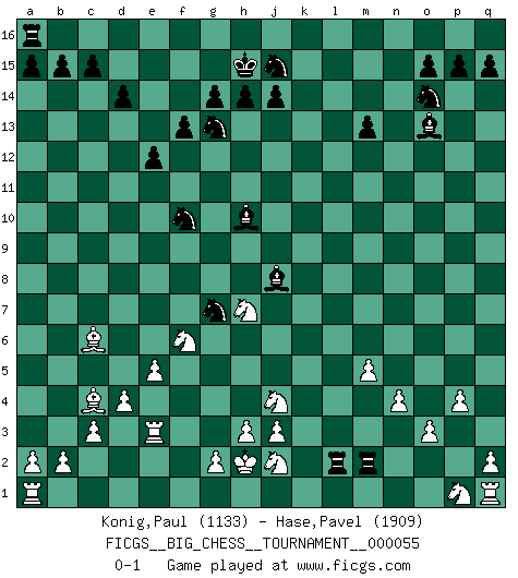Last move : 0-1 2010 April 2 1:40:46 [Event "FICGS__BIG_CHESS__TOURNAMENT__000055"] [Site "FICGS"] [Date "2009.12.03"] [Round "1"] [White "Konig,Paul"] [Black "Hase,Pavel"] [Result "0-1"] [WhiteElo "1133"] [BlackElo "1909"] 1.j2-k4 p16-o14 2.h1-o7 g15-g14 3.o7-l7 h16-c11 4.l7-l15 k16-l14 5.l15-f10 h15-g13 6.c2-c3 n15-n14 7.e2-e4 o16-f8 8.k4-h5 e15-e13 9.m2-m4 f16-c13 10.f10-p10 q16-p16 11.d2-d4 d15-d14 12.l1-m2 c13-g9 13.m2-f8 g9-f8 14.n2-n3 m15-m13 15.o1-g8 c16-h11 16.c1-o12 j15-k13 17.b1-d2 h11-e8 18.h5-f6 e8-l2 19.m1-l1 l2-g6 20.f2-f4 b16-d15 21.f1-c4 f15-f13 22.p10-p11 n14-n13 23.o12-n13 l14-n13 24.p11-n13 g6-n12 25.h2-g4 f8-m14 26.n13-k10 d15-f14 27.k10-m8 m14-j11 28.m8-j5 j11-f8 29.j5-q5 g16-j15 30.f6-h7 f8-h10 31.e4-e5 l16-o13 32.g4-f6 c11-p11 33.p2-p4 n12-j8 34.o2-o3 p11-g3 35.j1-h1 g3-f4 36.d2-f3 f14-g12 37.q5-g5 f4-g5 38.f3-g5 j16-h15 39.n3-n4 g12-f10 40.g8-f9 e13-e12 41.e1-e3 k13-j11 42.l1-l15 j11-h9 43.l15-k15 h9-g7 44.f9-c6 m16-k16 45.k15-k16 p16-k16 46.k1-l3 k16-k2 47.g1-j2 k2-m2 48.m4-m5 e16-l16 49.h1-h2 l16-l3 50.g5-j4 l3-l2 0-1 Follow this game move after move (download)He who fears an isolated Queen's Pawn should give up Chess. (Siegbert Tarrasch) Schach ist ein Teil der Kultur, und wenn es mit der Kultur abwärts geht, geht es auch mit dem Schach abwärts. (Mikhail Moiseyevich Botvinik) El Ajedrez te enseña a controlarl la excitación inicial que sientes cuando vez algo que parece bueno y te enseña a pensar objetivamente cuando te encuentras en problemas. (Stanley Kubrick) Vous m'avez demandé de vous exposer quel est le fondement de la prière. Je ne fais que préparer les pièces du jeu sur la table... Nous sera-t-il permis d'en adopter les règles et si nous les appliquons scrupuleusement nous ne tarderons pas à faire mat le Roi divin ! Il ne pourra échapper à nos mains. (Sainte Thérèse d'Avila, Chemin de perfection) To steal ideas from one person is plagiarism. To steal from many is research. (Unknown)