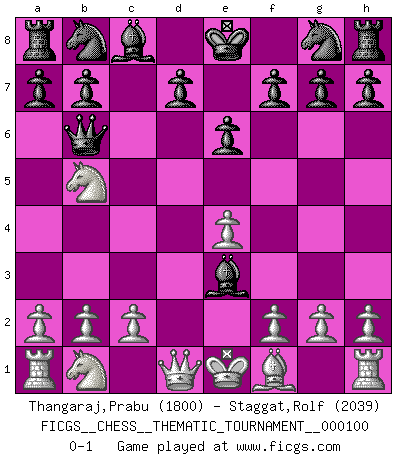 Last move : 0-1 2010 March 23 9:25:5 [Event "FICGS__CHESS__THEMATIC_TOURNAMENT__000100"] [Site "FICGS"] [Date "2009.12.04"] [Round "1"] [White "Thangaraj,Prabu"] [Black "Staggat,Rolf"] [Result "0-1"] [WhiteElo "1800"] [BlackElo "2039"] 1.e4 c5 2.Nf3 e6 3.d4 cxd4 4.Nxd4 Bc5 5.Be3 Qb6 6.Nb5 Bxe3 0-1 This chess game has been lost on time (started : 2009.12.04 10:54:51) Sicilian defense Player Black won this chess game. Follow this game move after move (download)A chess genius has died; a loss for humanity. (Viktor Kortchnoi, about Bobby Fischer's death) Aljechin war kein Nazi. Er war ein Opportunist. Ein schrecklicher Mann. Er liebte Geld über alles und würde für Geld ein Jude, ein Katolik oder ein Protestant werden. (Miguel Najdorf) No hay un Gran Maestro de Ajedrez que sea normal; solo se diferencían ellos por la magnitud de su locura. (Viktor Korchnoi) Pour se monter efficace, un Cavalier a besoin d'avant-postes ! Les Cavaliers font les meilleurs bloqueurs de pions passés. They say poker is a zero-sum game. It must be, because every time I play my sum ends up zero. (Max Shapiro)