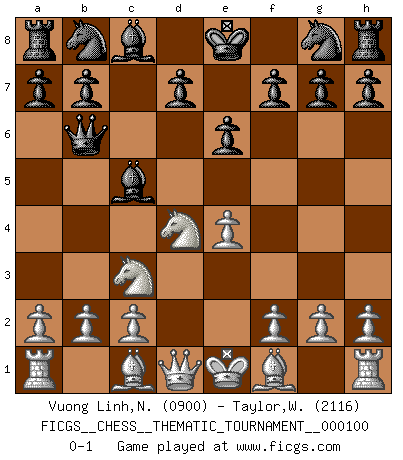 Last move : 0-1 2010 February 13 20:45:54 [Event "FICGS__CHESS__THEMATIC_TOURNAMENT__000100"] [Site "FICGS"] [Date "2009.12.04"] [Round "1"] [White "Vuong Linh,Nguyen"] [Black "Taylor,William"] [Result "0-1"] [WhiteElo "0900"] [BlackElo "2116"] 1.e4 c5 2.Nf3 e6 3.d4 cxd4 4.Nxd4 Bc5 5.Nc3 Qb6 0-1 This chess game has been lost on time (started : 2009.12.04 10:54:51) Sicilian defense Player Black won this chess game. Follow this game move after move (download)In Chess, just as in life, today's bliss may be tomorrow's poison. (Assaic) Es gibt keine einzige Frau, der ich nicht einen Springer vorgeben könnte und trotzdem gewänne. (Robert James Fischer) Con el tiempo, empecé a progresar en partidas decisivas. Tal vez porque me di cuenta de una simple verdad: no solo estaba yo nervioso sino también mi oponente. (Mikhail Tal) Les Echecs ont trois composantes : le temps, l'espace et le matériel en dernier. (Mikhail Tal) Is not life a hundred times too short to bore ourselves ? (Friedrich Nietzsche)
