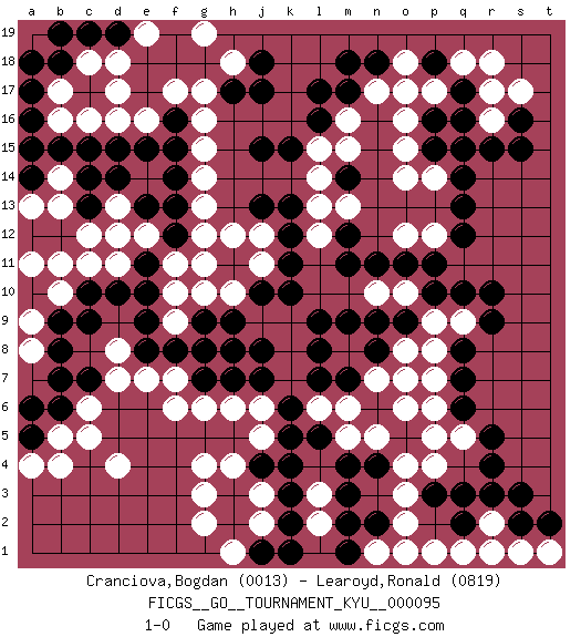 Last move : 1-0 2010 March 5 22:27:27 [Event "FICGS__GO__TOURNAMENT_KYU__000095"] [Site "FICGS"] [Date "2009.12.04"] [Round "1"] [Black "Cranciova,Bogdan"] [White "Learoyd,Ronald"] [Result "1-0"] [Rating 1 "0013"] [Rating 2 "0819"] 1.q16 d4 2.r4 d17 3.p3 c11 4.r10 o17 5.m17 o15 6.q13 q15 7.p16 o16 8.p15 o14 9.j17 g17 10.k15 g14 11.k3 g3 12.c7 c5 13.d10 d11 14.e8 f11 15.d15 c16 16.f15 g15 17.e13 g12 18.m14 o12 19.c13 b14 20.b15 b13 21.f13 g13 22.f16 g16 23.c15 d16 24.c14 c12 25.a18 b16 26.a16 b17 27.a17 g8 28.b18 c18 29.b19 e16 30.e15 f17 31.f14 p5 32.q6 q5 33.r5 p6 34.q7 o3 35.q3 o4 36.m3 m5 37.h2 g2 38.h3 g4 39.e10 f10 40.e11 e12 41.f12 d12 42.c10 b10 43.b9 a11 44.a12 a9 45.b8 a15 46.b12 l12 47.o9 j5 48.n2 o2 49.k1 l2 50.k2 n1 51.m1 o1 52.m2 h1 53.j1 j3 54.j4 h4 55.k4 j2 56.k5 j6 57.l5 m6 58.l7 l6 59.k6 k7 60.j7 k8 61.h7 g6 62.m4 l3 63.m7 n7 64.g7 b11 65.a14 a13 66.a15 f7 67.j8 k9 68.f8 f6 69.g9 f9 70.e9 g10 71.n6 n5 72.n8 o7 73.h9 h10 74.m9 e7 75.j10 j9 76.h8 d8 77.c9 d7 78.k10 h6 79.g8 r17 80.r15 r16 81.j13 j11 82.l9 l13 83.h11 g11 84.k11 j12 85.k12 h12 86.k13 l14 87.j15 l15 88.l16 m16 89.l17 m15 90.q14 o6 91.q17 q18 92.p18 r18 93.l8 p17 94.p11 p8 95.q8 p9 96.p10 q9 97.r9 p14 98.q15 r2 99.n18 o18 100.q2 q1 101.s2 s1 102.r3 r1 103.t2 o10 104.o11 p7 105.m11 n10 106.n11 p12 107.m12 m13 108.n4 p4 109.q12 h18 110.j18 o8 111.n9 p1 112.d19 d18 113.c19 e19 114.h17 g19 115.b6 b5 116.a5 a4 117.a6 b4 118.s16 c6 119.q10 s17 120.s15 n17 121.m18 t1 122.s3 d13 123.d14 a8 124.b7 1-0 Here are the names of the openings (joseki) played in the four corners : Corner q16 : q16 o17 Hoshi (Hwajeom, Seongjeom, Xingwei`) 4-4 Point. The star or hoshi (4-4) point, emphasizing influence at the potential expense of territory. Ikken Kakari (Hankan Keolch'im, Yi Gua`jiao~, 1-Space Low Approach). White 2 is the standard approach move to the 4-4. Player Black won this Go (weiqi, baduk) game. Follow this game move after move (download)If you don't know ladders, don't play go. (Anonymous) When you stop learning you start dying. (M. Scott Adams)