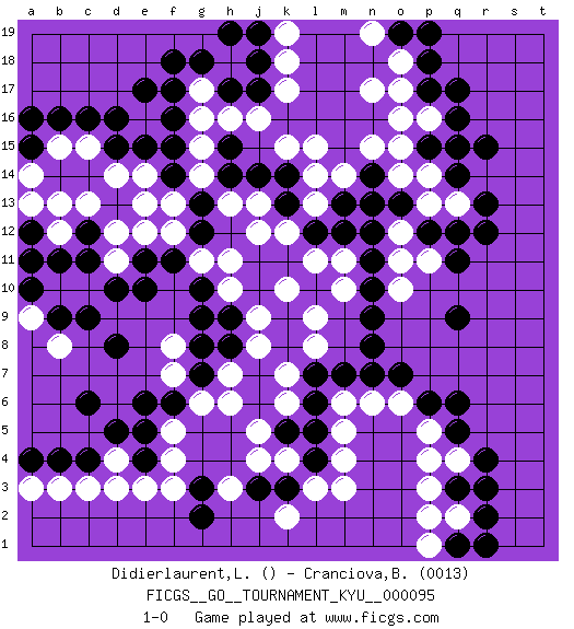 Last move : 1-0 2010 March 29 20:25:44 [Event "FICGS__GO__TOURNAMENT_KYU__000095"] [Site "FICGS"] [Date "2009.12.04"] [Round "1"] [Black "Didierlaurent,Ludovic"] [White "Cranciova,Bogdan"] [Result "1-0"] [Rating 2 "0013"] 1.q17 d4 2.c16 q4 3.r15 k17 4.e17 n17 5.r12 c10 6.q5 p4 7.r4 p5 8.q6 k4 9.r3 q2 10.q3 p3 11.r2 p2 12.q9 g17 13.d5 c3 14.d8 c13 15.e15 b8 16.e4 e3 17.c4 d3 18.c6 f4 19.e5 f5 20.f6 g6 21.g7 f7 22.e6 h7 23.g8 h6 24.k3 l3 25.l4 m4 26.l5 m3 27.c9 b10 28.j3 j5 29.d10 d11 30.e10 m5 31.l6 m6 32.l7 p16 33.p17 o16 34.m7 e13 35.e11 e12 36.b9 a9 37.c11 d12 38.b11 b12 39.a10 b15 40.b16 c15 41.c12 b13 42.p6 p13 43.p12 q13 44.q12 o12 45.n9 g14 46.f14 f13 47.g13 e14 48.f15 d14 49.h14 g15 50.h15 g16 51.g12 n13 52.h8 o10 53.n10 p11 54.n11 o11 55.n12 l13 56.d16 k10 57.l12 k12 58.k13 j13 59.k14 j12 60.j14 h13 61.m13 l14 62.n14 l15 63.o13 p14 64.f11 h10 65.k5 j4 66.f17 n15 67.g18 h18 68.f18 j8 69.h17 h16 70.j17 j16 71.j18 k18 72.h19 l9 73.n8 f8 74.g9 g11 75.g10 h11 76.r13 o14 77.n13 f12 78.b4 b3 79.q16 o6 80.o7 n6 81.n7 l11 82.m12 m10 83.a4 a3 84.q14 o18 85.p18 o17 86.a16 l8 87.o19 n19 88.p19 k19 89.j19 k7 90.q1 p1 91.r1 m14 92.a15 a14 93.g3 f3 94.g2 k2 95.p15 o15 96.q15 h3 97.q11 k6 98.f16 k15 99.h9 j9 100.a12 a13 101.a11 m11 102.d15 pass 103.pass 1-0 Here are the names of the openings (joseki) played in the four corners : Corner q4 : q4 q5 Hoshi (Hwajeom, Seongjeom, Xingwei`) 4-4 Point. The star or hoshi (4-4) point, emphasizing influence at the potential expense of territory. Corner d4 : d4 d5 Hoshi (Hwajeom, Seongjeom, Xingwei`) 4-4 Point. The star or hoshi (4-4) point, emphasizing influence at the potential expense of territory. Player Black won this Go (weiqi, baduk) game. Follow this game move after move (download)Very few good moves are played. (Pierre Audouard) Whoever said the pen is mightier than the sword obviously never encountered automatic weapons. (US General Douglas MacArthur)