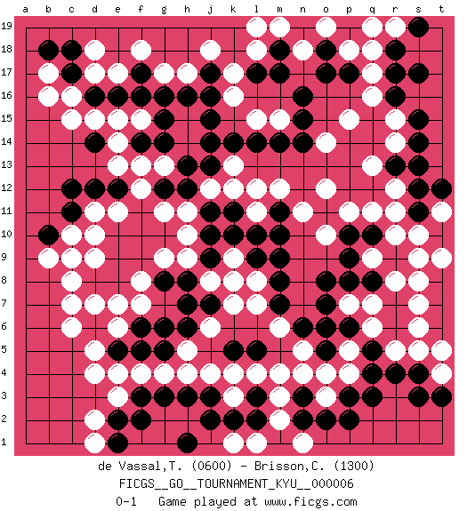 Last move : 0-1 2007 March 10 13:26:8 [Event "FICGS__GO__TOURNAMENT_KYU__000006"] [Site "FICGS"] [Date "2006.10.07"] [Round "1"] [Black "de Vassal,Thibault"] [White "Brisson,Claude"] [Result "0-1"] [Rating 1 "0600"] [Rating 2 "1300"] 1.q3 d4 2.r16 d17 3.p17 r10 4.r13 r5 5.l3 p4 6.o2 c15 7.q8 s8 8.o8 k17 9.c9 c7 10.c12 d10 11.e12 c10 12.d14 e3 13.g16 e15 14.g14 f13 15.g12 f12 16.f11 g13 17.h13 e11 18.f10 e13 19.k14 h15 20.h12 h14 21.r7 s7 22.s4 s5 23.s11 r11 24.s12 s10 25.t10 t9 26.r9 s9 27.r6 s6 28.r4 p5 29.m8 m4 30.k5 o10 31.m11 o12 32.q10 q11 33.p10 p11 34.m14 o14 35.n16 q13 36.g3 r14 37.s14 r12 38.s13 h4 39.h3 j4 40.j3 k4 41.h6 m6 42.d12 d9 43.g15 f15 44.j16 h17 45.h16 g17 46.f6 l4 47.q5 q6 48.q4 q7 49.p6 p7 50.o6 l7 51.k8 k7 52.j7 l8 53.l9 k9 54.m9 j8 55.h8 h9 56.g8 j6 57.h7 h5 58.g5 m3 59.l2 k3 60.k2 n5 61.o7 r8 62.l5 o3 63.p3 o4 64.n3 m2 65.o5 n4 66.n2 l1 67.j2 g4 68.f3 f4 69.e2 d2 70.e1 d1 71.f2 k12 72.k11 m12 73.p8 l11 74.l10 l12 75.k10 g11 76.g10 h11 77.j11 h10 78.j9 j12 79.j13 k13 80.j14 k8 81.j10 n11 82.d6 c6 83.e5 e4 84.d8 c8 85.f16 e17 86.e16 d15 87.d16 c16 88.f17 f18 89.j17 j18 90.l17 l18 91.f14 e14 92.e10 d11 93.m17 k16 94.j15 d7 95.m18 m15 96.n6 f7 97.m7 t4 98.t3 t5 99.s3 n1 100.p2 k1 101.h1 m19 102.c17 d18 103.c18 b17 104.b18 b16 105.n19 l19 106.n15 n18 107.o18 o19 108.e8 e7 109.e9 e6 110.f5 d5 111.g6 l15 112.l14 p18 113.o17 q18 114.r18 q17 115.r17 q16 116.n14 r15 117.s15 p15 118.b10 b9 119.c11 c9 120.m10 r19 121.s19 q19 122.s17 q9 123.p9 t11 124.t12 f8 125.f9 g9 0-1 Comment by player 1 : Thibault de Vassal : Oops.. la gaffe ! J'aurais mieux fait d'abandonner au lieu de jouer ce dernier coup stupide :) Décidément le chemin est long, la pente forte etc.. ;) Merci pour la partie (très instructive) ! Here are the names of the openings (joseki) played in the four corners : Corner q4 : q3 r5 Komoku (Somok, Xiao~mu`) 3-4 Point. The komoku (3-4) point is the traditional corner enclosure move.. Ikken Kakari (Hankan Keolch'im, Yi Gua`jiao~, 1-Space Low Pincer). The small knight move is the basic approach move to the 3-4 point stone. It has been continually used for over four centuries. There are limitless variations, with new moves constantly being discovered. White 2 opens the door to a treaure store of joseki. Corner d4 : d4 c9 Hoshi (Hwajeom, Seongjeom, Xingwei`) 4-4 Point. The star or hoshi (4-4) point, emphasizing influence at the potential expense of territory. Player White won this Go (weiqi, baduk) game. Follow this game move after move (download)Ikken tobi is never wrong. (Anonymous) Computers make it easier to do a lot of things, but most of the things they make it easier to do don't need to be done. (Andy Rooney)