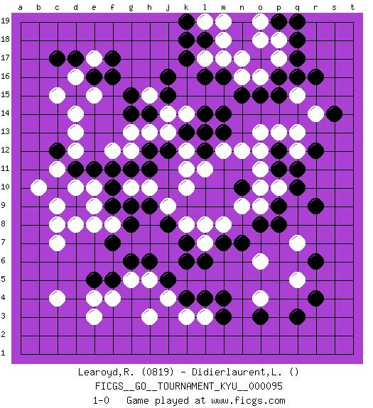 Last move : 1-0 2010 February 7 18:3:38 [Event "FICGS__GO__TOURNAMENT_KYU__000095"] [Site "FICGS"] [Date "2009.12.04"] [Round "1"] [Black "Learoyd,Ronald"] [White "Didierlaurent,Ludovic"] [Result "1-0"] [Rating 1 "0819"] 1.q16 c4 2.q3 d16 3.r9 e3 4.f17 e17 5.f16 d13 6.k17 d10 7.d15 e15 8.e16 d14 9.d17 c15 10.c17 h3 11.k4 k3 12.l4 l3 13.m4 j4 14.m3 r14 15.r12 q13 16.p11 q12 17.q11 q15 18.r16 c7 19.p16 l17 20.l16 m17 21.m16 n16 22.n15 o16 23.o15 p17 24.q17 p18 25.p15 o13 26.m14 n12 27.n10 o11 28.p12 p13 29.q18 o10 30.p9 o9 31.p8 h15 32.j16 k14 33.j15 j14 34.l14 o12 35.s14 q5 36.r4 o6 37.o8 n9 38.m7 o4 39.o3 k10 40.d9 c9 41.c10 c8 42.d11 e10 43.e11 c11 44.f10 e9 45.f9 d8 46.c12 b10 47.g11 d12 48.h14 h13 49.g14 g13 50.g15 f12 51.f11 f8 52.g8 p10 53.q10 l13 54.m13 m12 55.k13 j13 56.l12 k12 57.l13 l11 58.f7 e8 59.g6 n17 60.j5 h5 61.h6 g5 62.f5 f4 63.e5 e4 64.p19 o19 65.q19 o18 66.l18 m18 67.k18 l19 68.k19 m19 69.j12 k11 70.h12 g12 71.h11 m8 72.n7 k8 73.k7 l7 74.l6 l8 75.k6 q7 76.r6 h10 77.h9 j9 78.j8 g10 79.g9 1-0 Here are the names of the openings (joseki) played in the four corners : Corner d16 : d16 f17 Hoshi (Hwajeom, Seongjeom, Xingwei`) 4-4 Point. The star or hoshi (4-4) point, emphasizing influence at the potential expense of territory. Ikken Kakari (Hankan Keolch'im, Yi Gua`jiao~, 1-Space Low Approach). Black 2 is the standard approach move to the 4-4. Corner q16 : q16 r14 Hoshi (Hwajeom, Seongjeom, Xingwei`) 4-4 Point. The star or hoshi (4-4) point, emphasizing influence at the potential expense of territory. Ikken Kakari (Hankan Keolch'im, Yi Gua`jiao~, 1-Space Low Approach). White 2 is the standard approach move to the 4-4. Player Black won this Go (weiqi, baduk) game. Follow this game move after move (download)On the second line six die, eight live. (Anonymous) I've lost money so fast in these clubs it's left me reeling. I've read every poker book ever written, but the only way to get better at the game is to go out and play with people who are really good. The problem is, you stand to lose a lot of money doing it. (Matt Damon)