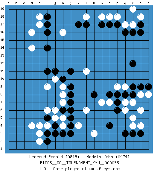 Last move : 1-0 2010 March 1 21:35:23 [Event "FICGS__GO__TOURNAMENT_KYU__000095"] [Site "FICGS"] [Date "2009.12.04"] [Round "1"] [Black "Learoyd,Ronald"] [White "Maddin,John"] [Result "1-0"] [Rating 1 "0819"] [Rating 2 "0474"] 1.q16 d4 2.q3 d16 3.r9 r5 4.o4 m3 5.p6 q7 6.r12 r17 7.r16 q17 8.p17 p18 9.o17 o18 10.n17 n18 11.j3 k4 12.f3 e2 13.f2 e3 14.f5 h4 15.h3 f4 16.g4 e4 17.j4 h5 18.j5 g5 19.g3 f6 20.h6 g6 21.j6 h7 22.j7 h8 23.j8 h9 24.j9 l6 25.m8 n7 26.o8 o7 27.p7 q6 28.q8 r7 29.s3 r4 30.r3 s4 31.h10 f9 32.j11 l11 33.f11 g10 34.g11 p9 35.p8 q9 36.r8 s8 37.s9 t8 38.t9 s6 39.f17 e18 40.f18 e17 41.f16 h16 42.f14 d14 43.s17 s18 44.s16 r19 45.l17 l18 46.k17 1-0 This go game has been lost on time (started : 2009.12.04 15:15:7) Here are the names of the openings (joseki) played in the four corners : Corner d4 : d4 j3 Hoshi (Hwajeom, Seongjeom, Xingwei`) 4-4 Point. The star or hoshi (4-4) point, emphasizing influence at the potential expense of territory. Corner d16 : d16 j11 Hoshi (Hwajeom, Seongjeom, Xingwei`) 4-4 Point. The star or hoshi (4-4) point, emphasizing influence at the potential expense of territory. Player Black won this Go (weiqi, baduk) game. Follow this game move after move (download)The enemy's vital point is your own. (Anonymous) To be champion requires more than simply being a strong player; one has to be a strong human being as well. (Anatoly Karpov)