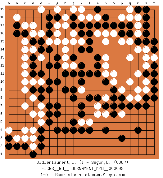 Last move : 1-0 2010 May 4 20:42:16 [Event "FICGS__GO__TOURNAMENT_KYU__000095"] [Site "FICGS"] [Date "2009.12.04"] [Round "1"] [Black "Didierlaurent,Ludovic"] [White "Segur,Laurine"] [Result "1-0"] [Rating 2 "0987"] 1.q17 d4 2.r4 d16 3.r15 q10 4.p3 h17 5.e4 c4 6.e3 e5 7.g4 d8 8.k4 h5 9.h4 q13 10.r7 p6 11.n4 c12 12.n17 q15 13.q16 p15 14.k17 j16 15.k16 k15 16.l15 h15 17.k14 j15 18.p8 o7 19.o8 g5 20.n7 r14 21.s15 n13 22.k7 g8 23.d12 c13 24.e11 g11 25.l14 n15 26.k11 j12 27.k12 k13 28.j13 l13 29.m13 l12 30.m12 o11 31.l11 j10 32.j11 h12 33.h11 h10 34.g12 h13 35.g13 h14 36.g10 f11 37.f10 c11 38.h9 h8 39.j9 g9 40.j8 e10 41.f12 d2 42.e2 d3 43.n10 s9 44.s8 n6 45.p7 m6 46.k6 l5 47.l4 k5 48.j5 m7 49.o6 n8 50.o7 j6 51.j4 j7 52.l8 k9 53.k10 s14 54.e15 e16 55.d15 f15 56.f14 c15 57.f16 g15 58.f17 g17 59.g18 h18 60.f18 k18 61.c16 c17 62.b16 d17 63.b17 c14 64.e14 b18 65.j17 l18 66.j18 j19 67.l16 m18 68.n18 g16 69.f9 f8 70.e9 d10 71.e8 e7 72.d9 c9 73.d7 d6 74.f7 h6 75.g7 h7 76.f5 c7 77.g6 p9 78.o9 o10 79.m8 q8 80.q7 r8 81.s7 o16 82.o17 m16 83.m17 g19 84.t9 s10 85.p16 n16 86.t10 t11 87.t8 r9 88.m19 e19 89.l17 k19 90.t14 t13 91.t15 e13 92.d13 d14 93.s11 s13 94.t12 s12 95.t11 r11 96.d11 c10 97.f6 e6 98.d1 r16 99.s16 r17 100.s17 r18 101.s18 q18 102.p17 p18 103.r19 q19 104.s19 n11 105.m11 n12 106.c2 c3 107.b2 b3 108.a3 a4 109.a2 1-0 Here are the names of the openings (joseki) played in the four corners : Corner d4 : d4 e4 Hoshi (Hwajeom, Seongjeom, Xingwei`) 4-4 Point. The star or hoshi (4-4) point, emphasizing influence at the potential expense of territory. Player Black won this Go (weiqi, baduk) game. Follow this game move after move (download)Win the stones, lose the game. (Anonymous) In God we trust, all others we virus scan. (Anonymous)
