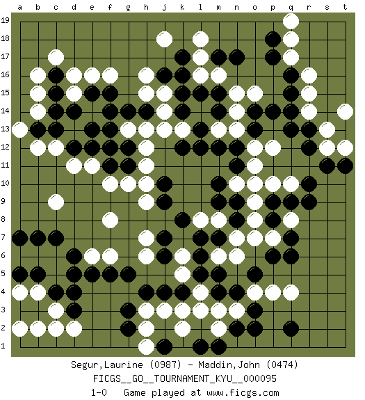 Last move : 1-0 2010 September 8 23:27:13 [Event "FICGS__GO__TOURNAMENT_KYU__000095"] [Site "FICGS"] [Date "2009.12.04"] [Round "1"] [Black "Segur,Laurine"] [White "Maddin,John"] [Result "1-0"] [Rating 1 "0987"] [Rating 2 "0474"] 1.d4 q4 2.q16 d16 3.r9 r14 4.r13 r16 5.m17 q17 6.p17 q18 7.p18 q19 8.q15 r15 9.q14 s13 10.r12 s12 11.s11 t12 12.t11 t14 13.h4 c3 14.c7 c5 15.c4 b4 16.d3 c2 17.d5 c6 18.d6 b6 19.b7 a6 20.a7 c9 21.d12 b12 22.c13 b14 23.c15 b16 24.c14 b15 25.c16 c17 26.b13 a13 27.b3 b2 28.a3 a4 29.a5 a2 30.b5 d2 31.o3 m3 32.n4 j3 33.k4 k3 34.g3 h2 35.g2 h3 36.n2 m2 37.m4 l4 38.l5 l3 39.j4 k2 40.j1 h1 41.l1 n3 42.o2 o4 43.o5 p4 44.m1 k5 45.m5 k6 46.m7 m6 47.l6 n6 48.l7 n7 49.j7 f8 50.n8 p7 51.p6 o8 52.p8 q8 53.p9 o9 54.q7 m8 55.n9 o10 56.m9 l8 57.k8 e11 58.f13 e14 59.e12 d11 60.q2 o7 61.q6 p10 62.q9 q10 63.r10 p12 64.o14 n13 65.o13 o12 66.n11 o11 67.n12 m13 68.m12 h11 69.j10 h10 70.j9 h9 71.f11 f10 72.g11 h13 73.g14 h15 74.h14 j14 75.f15 f16 76.e15 e16 77.d14 c12 78.e13 g13 79.g12 h12 80.k12 k13 81.l13 l14 82.l12 n15 83.m14 n14 84.m15 o15 85.p14 m16 86.l15 l16 87.k14 j13 88.k16 l17 89.k17 l18 90.n17 j18 91.j16 g10 92.f12 d15 93.f14 j15 94.k15 h16 95.q13 n10 96.m10 h6 97.j6 h7 98.g5 f6 99.f5 e6 100.e5 1-0 This go game has been lost on time (started : 2009.12.04 15:15:7) Here are the names of the openings (joseki) played in the four corners : Corner q4 : q4 r9 Hoshi (Hwajeom, Seongjeom, Xingwei`) 4-4 Point. The star or hoshi (4-4) point, emphasizing influence at the potential expense of territory. Corner q16 : q16 r14 Hoshi (Hwajeom, Seongjeom, Xingwei`) 4-4 Point. The star or hoshi (4-4) point, emphasizing influence at the potential expense of territory. Ikken Kakari (Hankan Keolch'im, Yi Gua`jiao~, 1-Space Low Approach). White 2 is the standard approach move to the 4-4. Corner d16 : d16 d12 Hoshi (Hwajeom, Seongjeom, Xingwei`) 4-4 Point. The star or hoshi (4-4) point, emphasizing influence at the potential expense of territory. Player Black won this Go (weiqi, baduk) game. Follow this game move after move (download)Beginner's games are surprising, often incoherent and incomprehensible. When you improve, your game gains in consistency but flirts with stupidity: you become satisfied with truisms and mechanical movements, you try to obtain a feeling for clearness and style the easy way. (Pierre Audouard) Fame, I have already. Now I need the money. (an elderly Steinitz)