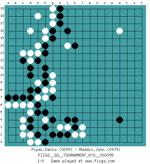 Last move : 1-0 2010 March 1 9:34:51 [Event "FICGS__GO__TOURNAMENT_KYU__000095"] [Site "FICGS"] [Date "2009.12.04"] [Round "1"] [Black "Pipac,Darko"] [White "Maddin,John"] [Result "1-0"] [Rating 1 "0699"] [Rating 2 "0474"] 1.d4 d16 2.q4 q16 3.e6 f4 4.f5 c3 5.d3 c4 6.e2 c2 7.g4 d5 8.e5 d6 9.d7 c6 10.c7 b6 11.b7 a6 12.a7 d2 13.f3 e1 14.f1 d1 15.g2 j3 16.j4 h3 17.k3 l3 18.j2 k2 19.k4 l2 20.h2 e7 21.e8 f7 22.g7 f8 23.f9 e9 24.d8 g9 25.f10 g8 26.d10 g10 27.f11 d12 28.e12 e13 29.f13 e14 30.c12 c13 31.d11 d13 32.f14 f15 33.g15 f16 34.g16 g17 35.h17 g18 36.h18 g19 37.h19 e18 38.j16 j14 39.k14 1-0 This go game has been lost on time (started : 2009.12.04 15:15:7) Here are the names of the openings (joseki) played in the four corners : Corner q4 : q4 l3 Hoshi (Hwajeom, Seongjeom, Xingwei`) 4-4 Point. The star or hoshi (4-4) point, emphasizing influence at the potential expense of territory. Corner d16 : d16 f11 Hoshi (Hwajeom, Seongjeom, Xingwei`) 4-4 Point. The star or hoshi (4-4) point, emphasizing influence at the potential expense of territory. Player Black won this Go (weiqi, baduk) game. Follow this game move after move (download)The possibility or impossibility of an event results logically from the rules. (Pierre Audouard) Over-the-board chess is the favorite of mortals, correspondence chess is the favorite of the gods. (Eduard Dyckhoff)