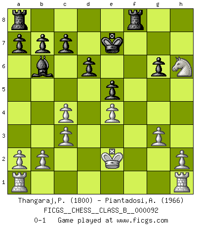 Last move : 0-1 2010 February 28 21:31:25 [Event "FICGS__CHESS__CLASS_B__000092"] [Site "FICGS"] [Date "2009.12.05"] [Round "1"] [White "Thangaraj,Prabu"] [Black "Piantadosi,Angelo"] [Result "0-1"] [WhiteElo "1800"] [BlackElo "1966"] 1.e4 e5 2.Bc4 Bc5 3.Qh5 Qf6 4.Nf3 d6 5.d3 g6 6.Qg5 Be6 7.Nc3 Bxc4 8.dxc4 Qxg5 9.Bxg5 Ne7 10.Bxe7 Kxe7 11.Ng5 h6 12.Nd5+ Kd7 13.Nxf7 Bxf2+ 14.Ke2 Rf8 15.Nxh6 Nc6 16.c3 Ne7 17.Nxe7 Kxe7 18.g3 Bb6 0-1 Bishop's Opening : Classical variation Player Black won this chess game. Follow this game move after move (download)Fischer Chess play was always razor-sharp, rational and brilliant. One of the best ever. (Dave Regis) Es gibt keine einzige Frau, der ich nicht einen Springer vorgeben könnte und trotzdem gewänne. (Robert James Fischer) El Ajedrez es la vida. (Bobby Fischer) Tous ces prétendus hommes politiques sont les pions, les Cavaliers, les Tours ou les Fous d'une partie d'échecs qui se jouera tant qu'un hasard ne renversera pas l'échiquier. (Honoré de Balzac) Men never do evil so completely and cheerfully as when they do it from religious conviction. (Blaise Pascal)