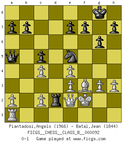 Last move : 0-1 2010 January 5 14:12:22 [Event "FICGS__CHESS__CLASS_B__000092"] [Site "FICGS"] [Date "2009.12.05"] [Round "1"] [White "Piantadosi,Angelo"] [Black "Batal,Jean"] [Result "0-1"] [WhiteElo "1966"] [BlackElo "1844"] 1.Nf3 Nf6 2.g3 g6 3.Bg2 Bg7 4.O-O O-O 5.d3 d6 6.Nc3 c5 7.e4 Nc6 8.Be3 Rb8 9.d4 Ng4 10.dxc5 Nxe3 11.fxe3 dxc5 12.Qe2 Bxc3 13.bxc3 Qa5 14.c4 Bg4 15.h3 Bxf3 16.Bxf3 Rfd8 17.Rfd1 Ne5 18.Rxd8+ Rxd8 19.Kf2 Rd2 0-1 Reti : King's Indian attack Kingside Castling by player White (move 4) Kingside Castling by player Black (move 4) Player Black won this chess game. Follow this game move after move (download)Those who say they understand Chess, understand nothing. (Robert Hubner) Ich bin stolz ein Bulgare zu sein. (Veselin Topalov) Entre mas años cumplo, mas valoro los Peones. (Keres) Aucun coup ne doit être joué sans but. (Pedro Damiano) You must have a dream in order to have it come true. (A.P.J. Kalam)