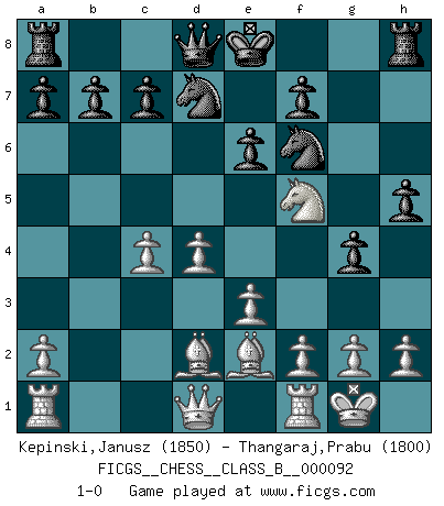 Last move : 1-0 2010 March 12 21:52:48 [Event "FICGS__CHESS__CLASS_B__000092"] [Site "FICGS"] [Date "2009.12.05"] [Round "1"] [White "Kepinski,Janusz"] [Black "Thangaraj,Prabu"] [Result "1-0"] [WhiteElo "1850"] [BlackElo "1800"] 1.d4 d5 2.c4 Bf5 3.Nc3 Nf6 4.e3 e6 5.Nf3 Bb4 6.cxd5 Nxd5 7.Bd2 Bxc3 8.bxc3 Nd7 9.Be2 g5 10.c4 N5f6 11.O-O g4 12.Nh4 h5 13.Nxf5 1-0 QGD : Grau (Sahovic) defense Kingside Castling by player White (move 11) Player White won this chess game. Follow this game move after move (download)You know, comrade Pachman, I don't enjoy being a Minister, I would rather play Chess like you. (Che Guevara) Das Zentrum ist der Balkan des Schachbretts - Kriegshandlungen können in jedem Moment ausbrechen. (Aaron Nimzowitsch) Debes de llevar a tu oponente hacia un profundo y obscuro bosque donde 2+2=5, y el camino que conduce a la salida es suficientemente ancho para solamente uno. (Mikhail Tal) Il s'avisa de me proposer d'apprendre les échecs qu'il jouait un peu... me voilà forcené des échecs. J'achète un échiquier, je m'enferme dans ma chambre, j'y passe des jours et des nuits à vouloir apprendre par cur toutes les parties. (Jean-Jacques Rousseau, Confessions) Just because you do not take an interest in politics doesn't mean politics won't take an interest in you. (Pericles 430 B.C.)