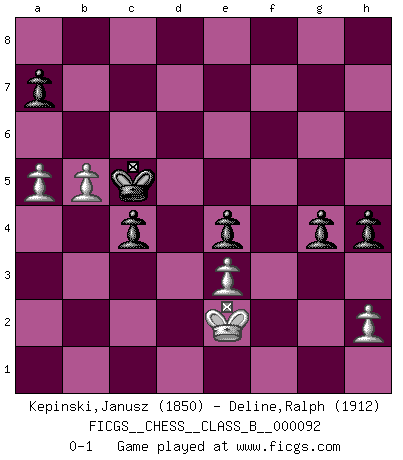 Last move : 0-1 2010 March 5 13:14:20 [Event "FICGS__CHESS__CLASS_B__000092"] [Site "FICGS"] [Date "2009.12.05"] [Round "1"] [White "Kepinski,Janusz"] [Black "Deline,Ralph"] [Result "0-1"] [WhiteElo "1850"] [BlackElo "1912"] 1.d4 Nf6 2.c4 g6 3.Nf3 Bg7 4.e3 O-O 5.Nc3 c5 6.Be2 cxd4 7.exd4 d5 8.O-O dxc4 9.Bxc4 Qc7 10.Bb3 Nc6 11.Qc2 Bg4 12.Be3 Bxf3 13.gxf3 Qd7 14.Ba4 Nxd4 15.Qd1 Nc6 16.Qxd7 Nxd7 17.Bxc6 bxc6 18.Rfd1 Ne5 19.Kg2 Rfd8 20.Bd4 Nc4 21.Bxg7 Kxg7 22.b3 Nb2 23.Rxd8 Rxd8 24.Re1 Rd7 25.Ne4 Nd3 26.Re3 f5 27.Nc3 Kf6 28.Ne2 e5 29.Kf1 g5 30.a3 c5 31.Nc3 Nc1 32.b4 c4 33.Re1 Nb3 34.Re3 Nd2+ 35.Kg2 Rd3 36.a4 e4 37.fxe4 Rxe3 38.fxe3 Nxe4 39.Nxe4+ fxe4 40.Kf2 g4 41.Ke2 Ke5 42.Kd2 h5 43.a5 Kd6 44.b5 h4 45.Ke2 Kc5 0-1 King's Indian, 3.Nf3 Kingside Castling by player Black (move 4) Kingside Castling by player White (move 8) Player Black won this chess game. Follow this game move after move (download)Castle early and often. (Rob Sillars) Der Schachmeister von Heute braucht Courage, einen Killerinstinkt, Ausdauer und Arroganz. (Larry Evans) Repentinamente, me resultaba obvio en mi analisis que yo había pasado por alto lo que Fischer había visto en el tablero con la mas grande facilidad. (Mikhail Botvinnik) Un journaliste : 'Vous préférez avoir une dame de plus sur l'échiquier ou au lit ?' Boris Spassky : 'Ca dépend de la position.' Warrior pose battles inner weakness and wins focus. You see that there is no war within you. You're on your own side, and you are your own strength. (Terri Guillemets)