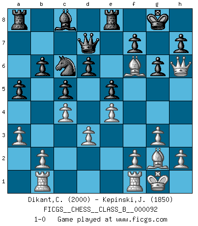 Last move : 1-0 2010 January 21 16:22:49 [Event "FICGS__CHESS__CLASS_B__000092"] [Site "FICGS"] [Date "2009.12.05"] [Round "1"] [White "Dikant,Christophe"] [Black "Kepinski,Janusz"] [Result "1-0"] [WhiteElo "2000"] [BlackElo "1850"] 1.c4 c5 2.Nc3 g6 3.g3 Bg7 4.Bg2 Nc6 5.e4 d6 6.Nge2 e6 7.d3 Nge7 8.O-O O-O 9.a3 a5 10.Rb1 Nd4 11.Nxd4 Bxd4 12.Bh6 Re8 13.Nb5 Nc6 14.Nxd4 Nxd4 15.Be3 Nc6 16.Qd2 b6 17.Bg5 Qd7 18.Bf6 e5 19.Qh6 1-0 English : Symmetrical variation Kingside Castling by player White (move 8) Kingside Castling by player Black (move 8) Player White won this chess game. Follow this game move after move (download)Fischer is completely natural. He plays no roles. He's like a child. Very, very simple. (Zita Rajcsanyi) Schach ist eine Sache der genauen Beurteilung, wann man zuschlagen und wann man sich ducken muss. (Robert James Fischer) Fischer no está bajo la obligación de nadie. (Joseph Platz) Toutes les manuvres exécutées sur une colonne ouverte ont pour but ultime l'intrusion définitive sur la septième ou la huitième rangée, en plein cur de la position ennemie. (Aaron Nimzovitch) Games, world of games... There's always an opponent, and there's always a victim. (Revolver, movie)