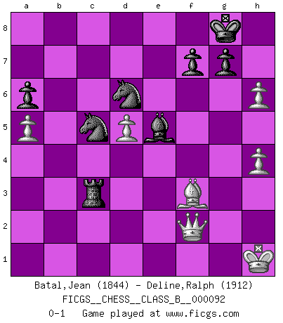 Last move : 0-1 2010 May 14 1:55:35 [Event "FICGS__CHESS__CLASS_B__000092"] [Site "FICGS"] [Date "2009.12.05"] [Round "1"] [White "Batal,Jean"] [Black "Deline,Ralph"] [Result "0-1"] [WhiteElo "1844"] [BlackElo "1912"] 1.c4 e5 2.Nc3 Nf6 3.g3 Bc5 4.Bg2 Nc6 5.a3 d6 6.e3 O-O 7.Nge2 Bb6 8.O-O Bf5 9.d4 Na5 10.b3 h6 11.Na4 c5 12.d5 Rc8 13.Nec3 Bc7 14.e4 Bd7 15.Nb2 Bb8 16.Nd3 a6 17.a4 Re8 18.Rb1 Bc7 19.Be3 Nh7 20.f4 exf4 21.Bxf4 Qe7 22.h3 b6 23.Rb2 Qf6 24.e5 dxe5 25.Bxe5 Bxe5 26.Rxf6 Bxf6 27.Rc2 Bf5 28.g4 Bg6 29.Ne2 Nxb3 30.Nef4 Bxd3 31.Nxd3 Nd4 32.Rf2 Re3 33.a5 b5 34.cxb5 Nxb5 35.Nf4 Bd4 36.Kh1 Nf6 37.Rf3 Rce8 38.Rxe3 Rxe3 39.Ne2 Be5 40.Qf1 Nd6 41.Qf2 Rd3 42.Bf3 c4 43.h4 c3 44.g5 Nd7 45.Nxc3 Rxc3 46.gxh6 Nc5 0-1 English : Carls' Bremen system Kingside Castling by player Black (move 6) Kingside Castling by player White (move 8) Player Black won this chess game. Follow this game move after move (download)Chess is not like life... it has rules ! (Mark Pasternak) Weshalb minderdergeübte Spieler mit g2-g4 beginnen? Die betreffenden sind unschlüssig, ob sie nun rechts (h4) oder links (f4) beginnen sollen, und in ihrer Ratlosigkeit entschliessen sie sich nach guter Bürgerart dazu, den goldenen Mittelweg zu wählen. (Aaron Nimzowitsch) No puedes jugar al Ajedrez si eres de corazón noble. (Proverbio Francés) Psychologiquement, tu dois avoir confiance en toi même, mais cette confiance doit être basée sur des faits. (Robert Fischer) A bird doesn't sing because it has an answer, it sings because it has a song. (Maya Angelou)