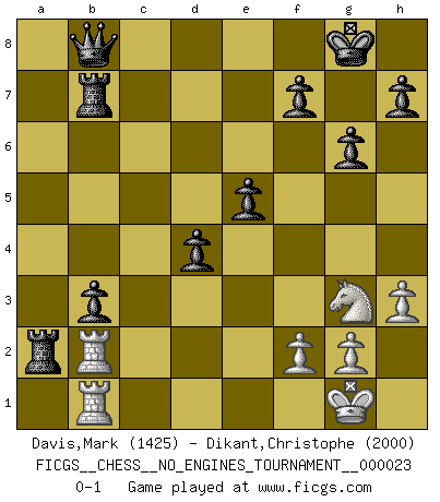 Last move : 0-1 2010 February 17 0:26:10 [Event "FICGS__CHESS__NO_ENGINES_TOURNAMENT__000023"] [Site "FICGS"] [Date "2009.12.08"] [Round "1"] [White "Davis,Mark"] [Black "Dikant,Christophe"] [Result "0-1"] [WhiteElo "1425"] [BlackElo "2000"] 1.e4 g6 2.Nf3 Bg7 3.d4 c6 4.Be3 d5 5.e5 Bg4 6.Be2 e6 7.h3 Bxf3 8.Bxf3 Nd7 9.Nc3 Ne7 10.Bf4 c5 11.O-O cxd4 12.Qxd4 Nc6 13.Qd1 O-O 14.Re1 Ndxe5 15.a3 Nxf3+ 16.Qxf3 a6 17.Rad1 Qb6 18.b4 Qd8 19.Ne2 Qc8 20.Bd6 Rd8 21.Bc5 Ne5 22.Qg3 Nc4 23.Be7 Rd7 24.Bc5 b6 25.Be3 Nxa3 26.Bxb6 Nxc2 27.Rc1 Qb7 28.Rxc2 Qxb6 29.Rb1 Qb8 30.Qa3 Rb7 31.Ng3 a5 32.Ne2 axb4 33.Qb3 Ra3 34.Qb2 Bxb2 35.Rcxb2 b3 36.Nd4 e5 37.Ne2 d4 38.Ng3 Ra2 0-1 Robatsch (Modern) defense Kingside Castling by player White (move 11) Kingside Castling by player Black (move 13) Player Black won this chess game. Follow this game move after move (download)Even the laziest King flees wildly in the face of a double check ! (Aaron Nimzowitsch) Was ist der Unterschied zwischen einem Strassenarbeiter und einem Schachspieler? --Der Schachspieler bewegt sich ab und zu. (Anonymous) La belleza de un movimiento no se refleja solo en su apariencia, sino en el pensamiento detrás de él. (Siegbert Tarrasch) Je ne suis pas le dernier à jouer lâchement des coups douteux pendant le zeïtnot de l'adversaire pour l'achever: en effet les coups qui font le plus peur sont ceux que l'on ne comprend pas. Je me fais souvent peur quand je joue. (Un professeur anonyme) Chess, like love, like music, has the power to make people happy. (Siegbert Tarrasch)