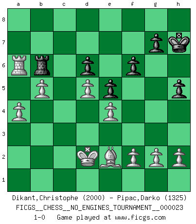 Last move : 1-0 2009 December 22 9:33:30 [Event "FICGS__CHESS__NO_ENGINES_TOURNAMENT__000023"] [Site "FICGS"] [Date "2009.12.08"] [Round "1"] [White "Dikant,Christophe"] [Black "Pipac,Darko"] [Result "1-0"] [WhiteElo "2000"] [BlackElo "1325"] 1.d4 e5 2.d5 c6 3.c4 Nf6 4.Nc3 Bb4 5.Bd2 cxd5 6.Nxd5 Nxd5 7.cxd5 Qa5 8.e4 d6 9.Nf3 Bg4 10.Be2 Bxf3 11.Bxf3 Bxd2+ 12.Qxd2 Qxd2+ 13.Kxd2 Nd7 14.Rhc1 O-O 15.Rc7 Nc5 16.b4 Na6 17.Rxb7 Rfb8 18.Rxb8+ Rxb8 19.a3 f6 20.Rc1 Kf7 21.Be2 Rb6 22.Rc8 Nb8 23.Rc7+ Kg6 24.Rxa7 h5 25.b5 Kh7 26.a4 Na6 27.Rxa6 1-0 Queen's pawn : Charlick (Englund) gambit Kingside Castling by player Black (move 14) Player White won this chess game. Follow this game move after move (download)Chess is ruthless: you've got to be prepared to kill people. (Nigel Short) Wenn du nicht weißt was du tun sollst, warte bis dein Gegner eine Idee hat. Sie wird sicher schlecht sein. (Siegbert Tarrasch) No hay precio que no valga la pena por la cabellera del Rey enemigo. (Koblentz) Comme les marins qui ont mille raisons différentes d'aller en mer, les joueurs d'échecs en ont tout autant avant de s'installer devant une table et jouer... (Vincent Bertignac, philosophe) The man who strikes first admits that his ideas have given out. (Chinese proverb)