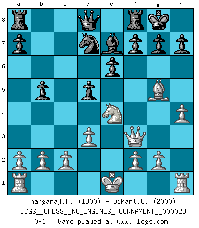Last move : 0-1 2010 February 28 21:31:25 [Event "FICGS__CHESS__NO_ENGINES_TOURNAMENT__000023"] [Site "FICGS"] [Date "2009.12.08"] [Round "1"] [White "Thangaraj,Prabu"] [Black "Dikant,Christophe"] [Result "0-1"] [WhiteElo "1800"] [BlackElo "2000"] 1.e4 d5 2.exd5 Nf6 3.Bc4 Nxd5 4.d3 c6 5.Nf3 Bg4 6.h3 Bxf3 7.Qxf3 e6 8.Nd2 Be7 9.Ne4 Nd7 10.Bg5 O-O 11.h4 b5 12.Bxd5 cxd5 0-1 Scandinavian defense Kingside Castling by player Black (move 10) Player Black won this chess game. Follow this game move after move (download)Dazzling combinations are for the many, shifting wood is for the few. (Georg Kieninger) Auf Remis zu spielen ist gewissermaßen ein Verbrechen gegen das Schachspiel. (Mikhail Nekhemyevich Tal) Muchos se han convertido en Maestros de Ajedrez, nadie se ha convertido en el Maestro del Ajedrez. (Siegbert Tarrasch) Horreur, mais aussi harmonie suprême : qu'y avait-il en effet au monde en dehors des échecs ? Le brouillard, l'inconnu, le non-être... (Vladimir Nabokov) Perception is reality. (Immanuel Kant)