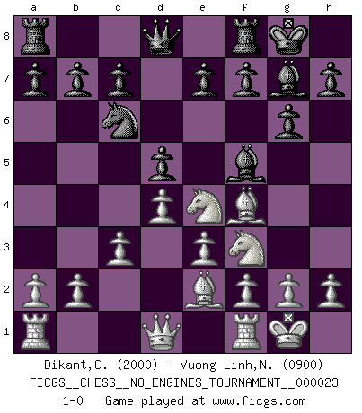 Last move : 1-0 2010 January 26 8:27:49 [Event "FICGS__CHESS__NO_ENGINES_TOURNAMENT__000023"] [Site "FICGS"] [Date "2009.12.08"] [Round "1"] [White "Dikant,Christophe"] [Black "Vuong Linh,Nguyen"] [Result "1-0"] [WhiteElo "2000"] [BlackElo "0900"] 1.d4 d5 2.Nf3 g6 3.Bf4 Bg7 4.e3 Nf6 5.Be2 O-O 6.O-O Nc6 7.c3 Ne4 8.Nbd2 Bf5 9.Nxe4 1-0 This chess game has been lost on time (started : 2009.12.08 3:40:34) Queen's pawn game Kingside Castling by player Black (move 5) Kingside Castling by player White (move 6) Player White won this chess game. Follow this game move after move (download)You are for me the Queen on d8 and I am the Pawn on d7 !! (Eduard Gufeld) Es ist besser die Steine des Gegners zu opfern. (Savielly Grigorievitsch Tartakower) Las combinaciones han sido siempre el aspecto más intrigante del Ajedrez. Los Maestros las buscan, el público las aplauden, los críticos las alaban. La razón se debe a que las combinaciones hacen posible que el Ajedrez sea más que un ejercicio matemático con una carencia de vida. Ellas son la poesía del juego, son del Ajedrez lo que la melodía es de la música. Ellas representan el triunfo de la mente sobre la materia. (Reuben Fine) Shah mat. Le roi est mort. Cri de fierté d'un joueur venant de terrasser son adversaire, courtoisement, sans effusion de sang. The Internet isn't free. It just has an economy that makes no sense to capitalism. (Brad Shapcott)