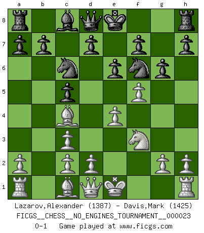 Last move : 0-1 2010 January 29 20:39:21 [Event "FICGS__CHESS__NO_ENGINES_TOURNAMENT__000023"] [Site "FICGS"] [Date "2009.12.08"] [Round "1"] [White "Lazarov,Alexander"] [Black "Davis,Mark"] [Result "0-1"] [WhiteElo "1387"] [BlackElo "1425"] 1.e4 c5 2.f4 Nc6 3.Nc3 g6 4.Nf3 Bg7 5.Bc4 e6 6.f5 Bxc3 7.bxc3 Nf6 0-1 This chess game has been lost on time (started : 2009.12.08 3:40:34) Sicilian : Grand Prix attack Player Black won this chess game. Follow this game move after move (download)Fischer prefers to enter Chess history alone. (Miguel Najdorf) Ich möchte Schüler heranbilden, die das Vermögen haben, selbst zu denken und Kritik zu üben. (Emanuel Lasker) Un entendimiento a fondo de las continuaciones típicas del mate, hace de las combinaciones de sacrificio mas complicadas conducirlas a ellas no solo sin dificultad, sino casi de una manera natural. (Siegbert Tarrasch) Une platitude souvent récitée à propos des Echecs est qu'une des choses les plus difficiles à réaliser est de gagner une position gagnante. Cela ne manque pas de sens mais, pour ma part, j'ai toujours trouvé plus difficile de gagner une position perdante. (Tim Krabbe) Is not life a hundred times too short to bore ourselves ? (Friedrich Nietzsche)