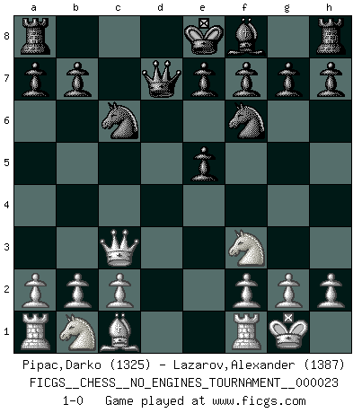 Last move : 1-0 2010 January 28 20:36:45 [Event "FICGS__CHESS__NO_ENGINES_TOURNAMENT__000023"] [Site "FICGS"] [Date "2009.12.08"] [Round "1"] [White "Pipac,Darko"] [Black "Lazarov,Alexander"] [Result "1-0"] [WhiteElo "1325"] [BlackElo "1387"] 1.e4 c5 2.Nf3 d6 3.Bb5+ Bd7 4.Bxd7+ Qxd7 5.d4 cxd4 6.Qxd4 Nc6 7.Qc3 Nf6 8.e5 dxe5 9.O-O 1-0 This chess game has been lost on time (started : 2009.12.08 3:40:34) Sicilian : Canal-Sokolsky attack, 3...Bd7 Kingside Castling by player White (move 9) Player White won this chess game. Follow this game move after move (download)Alekhine is a poet who creates a work of art out of something that would hardly inspire another man to send home a picture post card. (Max Euwe) Ich spiele 70 Eröffnungssysteme. (Viktor Kortschnoi) El Ajedrez demanda una total concentración. (Bobby Fischer) Les pièces de l'échiquier étaient impitoyables. Elles le retenaient, elles l'absorbaient. Il y avait de l'horreur en cela, mais aussi une harmonie unique. Car, qu'y a-t-il dans le monde, à part les échecs ? (V. Nabokov) I can't decide which is riskier; taking crazy risks, or taking advice on crazy risks from a crazy risk taker. (Gregory House in House M.D.)