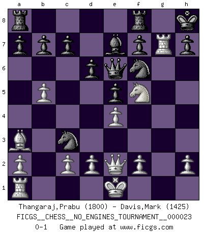 Last move : 0-1 2010 March 7 9:38:52 [Event "FICGS__CHESS__NO_ENGINES_TOURNAMENT__000023"] [Site "FICGS"] [Date "2009.12.08"] [Round "1"] [White "Thangaraj,Prabu"] [Black "Davis,Mark"] [Result "0-1"] [WhiteElo "1800"] [BlackElo "1425"] 1.b4 e5 2.Ba3 Nf6 3.e3 Nc6 4.b5 Ne7 5.g4 d6 6.Nc3 Bxg4 7.Be2 Bxe2 8.Qxe2 Ned5 9.Nf3 Be7 10.Nh4 O-O 11.Nf5 Qc8 12.e4 Qe6 13.Rg1 Nxc3 14.Rxg7+ Kh8 0-1 Polish (Sokolsky) opening Kingside Castling by player Black (move 10) Player Black won this chess game. Follow this game move after move (download)A big shock; the best chess player in history has passed away. (Lajos Portisch, about Bobby Fischer's death) Ich moechte nie einem Club beitreten, der Leute wie mich als Mitglieder aufnimmt. (Woody Allen) La maestría del Ajedrez consiste esencialmente en analizar posiciónes de Ajedrez con precisión. (Mikhail Botvinnik) Les échecs, c'est la lutte contre l'erreur. (Johannes Zukertort) I believe in luck. How else can you explain the success of those you dislike ? (Jean Cocteau)