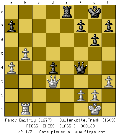 Last move : 1/2-1/2 2010 February 13 11:39:7 [Event "FICGS__CHESS__CLASS_C__000130"] [Site "FICGS"] [Date "2009.12.09"] [Round "1"] [White "Panov,Dmitriy"] [Black "Bullerkotte,Frank"] [Result "1/2-1/2"] [WhiteElo "1677"] [BlackElo "1609"] 1.e4 c6 2.d4 d5 3.exd5 cxd5 4.c4 Nf6 5.Nf3 Nc6 6.c5 Bg4 7.Be2 e6 8.O-O Be7 9.h3 Bxf3 10.Bxf3 O-O 11.a3 b6 12.b4 e5 13.dxe5 Nxe5 14.cxb6 Nxf3+ 15.Qxf3 Qxb6 16.Nc3 Rad8 17.Bg5 d4 18.Bxf6 Qxf6 19.Nd5 Qd6 20.Nxe7+ Qxe7 21.Qd3 Rd5 22.Rfe1 Re5 23.Rxe5 Qxe5 24.Rc1 g6 25.b5 Re8 26.a4 Qf4 27.Rb1 1/2-1/2 Caro-Kann : Panov-Botvinnik attack Kingside Castling by player White (move 8) Kingside Castling by player Black (move 10) This chess game ended in a draw. Follow this game move after move (download)Of Chess it has been said that life is not long enough for it, but that is the fault of life, not Chess. (William Ewart Napier) Schach ist eine Sache der genauen Beurteilung, wann man zuschlagen und wann man sich ducken muss. (Robert James Fischer) Fischer no está bajo la obligación de nadie. (Joseph Platz) Le succès, c'est être capable d'aller d'échec en échec sans perdre son enthousiasme. (Winston Churchill) Without enthusiasm, virtue functions not at all, and vice only poorly. (Mignon McLaughlin, The Neurotic's Notebook, 1960)