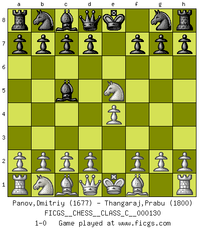 Last move : 1-0 2010 March 1 21:35:23 [Event "FICGS__CHESS__CLASS_C__000130"] [Site "FICGS"] [Date "2009.12.09"] [Round "1"] [White "Panov,Dmitriy"] [Black "Thangaraj,Prabu"] [Result "1-0"] [WhiteElo "1677"] [BlackElo "1800"] 1.e4 e5 2.Nf3 Bc5 3.Nxe5 1-0 King's knight Opening Player White won this chess game. Follow this game move after move (download)Bobby Fischer's current state of mind is indeed a tragedy. One of the world's greatest Chess players - the pride and sorrow of American Chess. (Frank Brady) Je älter ich werde, um so mehr schätze ich die Bauern. (Paul Keres) Nunca nadie ha ganado una partida de Ajedrez rindiendose. (Unknown) Mon pion favori sur ma case favorite ! Bronstein en parlant d'un coup de pion en h5 quand il avait les Noirs. Information on the Internet is subject to the same rules and regulations as conversation at a bar. (George Lundberg)