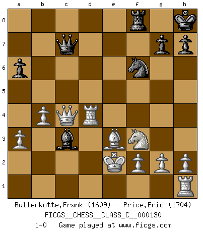Last move : 1-0 2010 January 9 23:5:48 [Event "FICGS__CHESS__CLASS_C__000130"] [Site "FICGS"] [Date "2009.12.09"] [Round "1"] [White "Bullerkotte,Frank"] [Black "Price,Eric"] [Result "1-0"] [WhiteElo "1609"] [BlackElo "1704"] 1.d4 Nf6 2.c4 e6 3.Nc3 Bb4 4.Qc2 c5 5.dxc5 O-O 6.a3 Bxc5 7.Nf3 b6 8.Bf4 Bb7 9.Rd1 Nc6 10.b4 Be7 11.e4 Rc8 12.e5 Nh5 13.Be3 a6 14.Na4 b5 15.Nb6 Rc7 16.Qb3 bxc4 17.Bxc4 d6 18.Bxe6 fxe6 19.Qxe6+ Kh8 20.exd6 Bf6 21.dxc7 Bc3+ 22.Ke2 Qxc7 23.Nd5 Nd4+ 24.Rxd4 Bxd5 25.Qxd5 Nf6 26.Qc4 1-0 Nimzo-Indian : Classical, Pirc variation Kingside Castling by player Black (move 5) Player White won this chess game. Follow this game move after move (download)One doesn't have to play well, it's enough to play better than your opponent. (Siegbert Tarrasch) Mein erstes Ziel war nicht, die Partie zu gewinnen, sondern eine Figur zu opfern. -- der junge (Wilhelm Steinitz) Hasta este punto, las blancas han seguido un análisis bien conocido. Pero ahora el hace un error fatal: empieza a usar su propia cabeza. (Siegbert Tarrasch) Le thème de l'attaque double intervient d'une manière ou d'une autre dans l'immense majorité des combinaisons. (Youri Averbakh) When it is a question of money, everybody is of the same religion. (Voltaire)