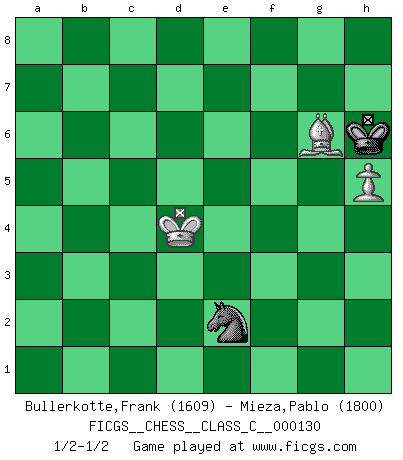 Last move : 1/2-1/2 2010 January 24 9:37:8 [Event "FICGS__CHESS__CLASS_C__000130"] [Site "FICGS"] [Date "2009.12.09"] [Round "1"] [White "Bullerkotte,Frank"] [Black "Mieza,Pablo"] [Result "1/2-1/2"] [WhiteElo "1609"] [BlackElo "1800"] 1.d4 Nf6 2.c4 e6 3.Nc3 Bb4 4.Nf3 d5 5.Qa4+ Nc6 6.Ne5 Bd7 7.Nxd7 Qxd7 8.a3 Bxc3+ 9.bxc3 O-O 10.e3 h5 11.Qc2 Na5 12.cxd5 exd5 13.Bd3 c5 14.dxc5 Qc7 15.a4 Nc4 16.O-O Qxc5 17.Rd1 Rac8 18.Be2 Qa5 19.Rd4 Ne4 20.Bb2 Nxb2 21.Qxb2 Qxc3 22.Qxc3 Nxc3 23.Bxh5 Rc5 24.Bf3 b6 25.g3 Rfc8 26.Kf1 Kf8 27.Bd1 Ke7 28.Kg2 Ra5 29.Bb3 Kd6 30.Rc1 Rac5 31.h4 a5 32.Ra1 b5 33.axb5 Rxb5 34.Bc2 Rb2 35.Bf5 Rc4 36.Rxa5 g6 37.Bg4 Rxd4 38.exd4 Ne4 39.Ra7 f5 40.Bh3 Rxf2+ 41.Kg1 Ke6 42.g4 fxg4 43.Bxg4+ Kf6 44.Ra6+ Kg7 45.Be6 Rf4 46.Bxd5 Nf6 47.Ra7+ Kh6 48.Bc6 Rxd4 49.Ra4 Rxa4 50.Bxa4 Kh5 51.Bc2 Ng4 52.Bxg6+ Kh6 53.h5 Nf6 54.Kg2 Ng4 55.Kg3 Nf6 56.Kf4 Nd5+ 57.Ke5 Nc3 58.Kd4 Ne2+ 1/2-1/2 Nimzo-Indian : Three knights variation Kingside Castling by player Black (move 9) Kingside Castling by player White (move 16) 10 pieces endgame at move 43 : White KRBPP , Black KRNPP WHITE : King + 1 Rook 1 Bishop 2 Pawns BLACK : King + 1 Rook 1 Knight 2 Pawns 9 pieces endgame at move 46 : White KRBPP , Black KRNP WHITE : King + 1 Rook 1 Bishop 2 Pawns BLACK : King + 1 Rook 1 Knight 1 Pawn 8 pieces endgame at move 48 : White KRBP , Black KRNP WHITE : King + 1 Rook 1 Bishop 1 Pawn BLACK : King + 1 Rook 1 Knight 1 Pawn 7 pieces endgame at move 49 : White KBP , Black KRNP WHITE : King + 1 Bishop 1 Pawn BLACK : King + 1 Rook 1 Knight 1 Pawn 6 pieces endgame at move 50 : White KBP , Black KNP WHITE : King + 1 Bishop 1 Pawn BLACK : King + 1 Knight 1 Pawn 5 pieces endgame at move 52 : White KBP , Black KN WHITE : King + 1 Bishop 1 Pawn BLACK : King + 1 Knight This chess game ended in a draw. Follow this game move after move (download)Place the contents of the Chess box in a hat, shake them up vigorously, pour them on the board from a height of two feet, and you get the style of Steinitz. (H. E. Bird) Nicht daß Diemer aus Opportunismus Mitglied der NSDAP geworden wäre. Er war ein Fanatiker, in allem, was er tat. (Hans Ree) El Ajedrez es un invernadero donde los frutos del carácter pueden madurar mas completamente que en la vida. (Edward Morgan Foster) La tactique, c'est ce que vous faites quand il y a quelque chose à faire; la stratégie, c'est ce que vous faites quand il n'y a rien à faire. (Savielli Tartacower) Wisdom doesn't necessarily come with age. Sometimes age just shows up all by itself. (Tom Watson)