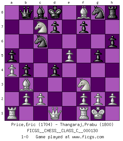 Last move : 1-0 2010 March 1 9:34:51 [Event "FICGS__CHESS__CLASS_C__000130"] [Site "FICGS"] [Date "2009.12.09"] [Round "1"] [White "Price,Eric"] [Black "Thangaraj,Prabu"] [Result "1-0"] [WhiteElo "1704"] [BlackElo "1800"] 1.e4 e5 2.Nf3 Nc6 3.Bb5 Qf6 4.Nc3 a6 5.Ba4 b5 6.Nd5 Qd6 7.Bb3 a5 8.a4 b4 9.O-O h6 10.d4 exd4 11.Bf4 Qc5 12.Nxc7+ Kd8 13.Nxa8 g5 14.Bc7+ Ke8 15.Bb6 Qd6 16.e5 Qb8 17.Nc7+ Ke7 18.Bc5+ Kd8 19.Bxf8 1-0 Ruy Lopez (Spanish Opening) Kingside Castling by player White (move 9) Player White won this chess game. Follow this game move after move (download)The Pin is mightier than the sword. (Fred Reinfeld) Das Schach hält seine Meister in eigenen Banden, Fesseln; auf vielerlei Weise formt es ihren Geist, so dass die innere Freiheit selbst des Stärksten beeinflusst wird. (Albert Einstein) En partidas rápidas, el Caballo es mas poderoso que el Alfil. (Vlastimil Hort) Le pion, dans sa simplicité, marche droit devant lui, mais lorsqu'il prend, il le fait obliquement? Ainsi l'homme, tant qu'il reste pauvre, marche dans la droiture et vit honnêtement, mais lorsqu'il recherche les honneurs, il flatte, se parjure et, par les voies obliques, cherche une position supérieure sur l'échiquier du monde. (Jean de Galles) Don't be discouraged. It's often the last key in the bunch that opens the lock. (Author unknown)