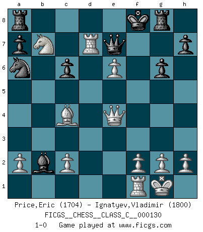 Last move : 1-0 2009 December 27 20:38:42 [Event "FICGS__CHESS__CLASS_C__000130"] [Site "FICGS"] [Date "2009.12.09"] [Round "1"] [White "Price,Eric"] [Black "Ignatyev,Vladimir"] [Result "1-0"] [WhiteElo "1704"] [BlackElo "1800"] 1.e4 e5 2.Nf3 d6 3.d4 f5 4.dxe5 fxe4 5.Ng5 d5 6.e6 Nh6 7.Nc3 c6 8.Ngxe4 dxe4 9.Qh5+ g6 10.Qe5 Rg8 11.Bxh6 Bxh6 12.Rd1 Qe7 13.Bc4 Bg7 14.Qxe4 b5 15.Nxb5 Bb7 16.Nd6+ Kf8 17.Nxb7 Bxb2 18.O-O Na6 19.Rd7 1-0 Philidor : Philidor counter-gambit, del Rio attack Kingside Castling by player White (move 18) Player White won this chess game. Follow this game move after move (download)Discovered check is the dive bomber of the Chessboard. (Reuben Fine) Obwohl ich alt bin, darf mir niemand den Finger in den Mund stecken, sonst beisse ich. (Wilhelm Steinitz) El estómago es una parte esencial del maestro de Ajedrez. (Bent Larsen) Les Cavaliers se révèlent fort utiles dans les positions fermées. D'habitude, les Fous sont un peu plus forts que les Cavaliers dans les positions ouvertes. Qu'on le veuille ou non, il restera toujours des exceptions ! I find television to be very educating. Every time somebody turns on the set, I go in the other room and read a book. (Groucho Marx)