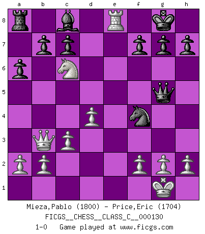 Last move : 1-0 2009 December 29 23:59:20 [Event "FICGS__CHESS__CLASS_C__000130"] [Site "FICGS"] [Date "2009.12.09"] [Round "1"] [White "Mieza,Pablo"] [Black "Price,Eric"] [Result "1-0"] [WhiteElo "1800"] [BlackElo "1704"] 1.e4 e5 2.Nf3 Nc6 3.Bb5 a6 4.Ba4 Nf6 5.O-O Nxe4 6.Re1 Nc5 7.Bxc6 dxc6 8.Nxe5 Be7 9.d4 Ne6 10.Be3 O-O 11.Nc3 Bg5 12.Bxg5 Qxg5 13.Ne4 Qf5 14.Ng3 Qf6 15.c3 Rd8 16.Re3 Qe7 17.Qb3 Qd6 18.Nf5 Qf8 19.Rae1 Nf4 20.Ne7+ Qxe7 21.Nxc6 Qg5 22.Re8+ Rxe8 23.Rxe8+ 1-0 Ruy Lopez : Open (Tarrasch) defense Kingside Castling by player White (move 5) Kingside Castling by player Black (move 10) Player White won this chess game. Follow this game move after move (download)In order to improve your game, you must study the endgame before everything else, for whereas the endings can be studied and mastered by themselves, the middle game and the opening must be studied in relation to the endgame. (Jose Raul Capablanca) Am wohlsten fühle ich mich, wenn ich sehe, wie sich mein Gegner im Todeskampf windet. (Robert James Fischer) Personalmente, yo prefiero mirar hacia el futuro en donde un programa de computadora gane el título mundial de Ajedrez. La humanidad necesita una lección de humildad. (Richard Dawkings) Je ne crois pas en la psychologie, je crois aux bons coups. (Robert Fischer) Being number two sucks. (Andre Agassi)