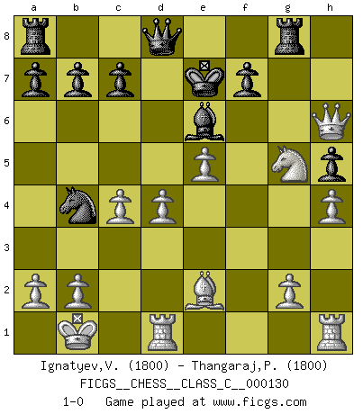 Last move : 1-0 2010 February 28 21:35:42 [Event "FICGS__CHESS__CLASS_C__000130"] [Site "FICGS"] [Date "2009.12.09"] [Round "1"] [White "Ignatyev,Vladimir"] [Black "Thangaraj,Prabu"] [Result "1-0"] [WhiteElo "1800"] [BlackElo "1800"] 1.e4 e5 2.f4 exf4 3.Nf3 Nc6 4.d4 g5 5.h4 g4 6.Ng1 Nf6 7.e5 Nd5 8.c4 Ne3 9.Bxe3 fxe3 10.Qxg4 d5 11.Qf4 Bb4+ 12.Nc3 Rg8 13.O-O-O Bg4 14.Be2 h5 15.Nxd5 Bd2+ 16.Kb1 Kf8 17.Nf3 Be6 18.Nxe3 Bxe3 19.Qxe3 Nb4 20.Qh6+ Ke7 21.Ng5 1-0 King's knight's gambit Queenside Castling by player White (move 13) Player White won this chess game. Follow this game move after move (download)I guess a certain amount of temperament is expected of Chess geniuses. (Ron Gross) Das Schachspiel übertrifft alle anderen Spiele so weit wie der Chimborasso einen Misthaufen. (Arthur Schopenhauer) Todo lo que importa ante el tablero de Ajedrez son buenas jugadas. (Bobby Fischer) Je menace de comprendre la position. (Anonyme) Strategy without tactics is the slowest route to victory. Tactics without strategy is the noise before defeat. (Sun Tzu)