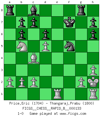 Last move : 1-0 2010 March 1 9:34:51 [Event "FICGS__CHESS__RAPID_B__000133"] [Site "FICGS"] [Date "2009.12.09"] [Round "1"] [White "Price,Eric"] [Black "Thangaraj,Prabu"] [Result "1-0"] [WhiteElo "1704"] [BlackElo "1800"] 1.e4 e5 2.Nf3 Bc5 3.Nc3 Nc6 4.Nxe5 Bxf2+ 5.Kxf2 Nxe5 6.d4 Qf6+ 7.Kg1 Ng4 8.Qd2 Ne7 9.h3 Nh6 10.Qf2 Qb6 11.d5 f5 12.Qxb6 axb6 13.Bxh6 gxh6 14.exf5 Nxf5 15.Re1+ Kf7 16.Bc4 d6 17.Kh2 Rg8 18.Nb5 1-0 King's knight Opening Player White won this chess game. Follow this game move after move (download)For me, Chess is life and every game is like a new life. Every Chess player gets to live many lives in one lifetime. (Eduard Gufeld) Du kannst im Schach nur gut werden, wenn du das Spiel liebst. (Robert James Fischer) Solo los afeminados hacen el Enroque. (Rob Sillars) Le plus grand jeu de l'esprit jamais inventé, plus vous l'apprenez, plus vous y prenez du plaisir. (Garry Kasparov) Life is like internet, nothing interesting, but noone want to leave it. (Ilmars Cirulis)