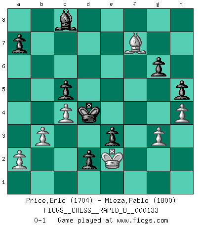 Last move : 0-1 2010 January 30 14:38:23 [Event "FICGS__CHESS__RAPID_B__000133"] [Site "FICGS"] [Date "2009.12.09"] [Round "1"] [White "Price,Eric"] [Black "Mieza,Pablo"] [Result "0-1"] [WhiteElo "1704"] [BlackElo "1800"] 1.e4 c5 2.Nf3 Nc6 3.d4 cxd4 4.Nxd4 e6 5.Nc3 Nf6 6.Bg5 h6 7.Bh4 Be7 8.Nxc6 bxc6 9.Bg3 Qa5 10.Qd2 O-O 11.f3 d5 12.e5 Nd7 13.f4 Rb8 14.Nd1 Qxd2+ 15.Kxd2 f6 16.Bd3 fxe5 17.fxe5 Bg5+ 18.Ke2 Bf4 19.Bxf4 Rxf4 20.Rf1 Rxf1 21.Kxf1 Nxe5 22.Be2 Kf7 23.b3 Ke7 24.Ne3 c5 25.Ng4 Nxg4 26.Bxg4 Ba6+ 27.Kg1 Rb4 28.h3 e5 29.c3 Rf4 30.g3 Rf8 31.Rd1 Kd6 32.Kg2 e4 33.c4 d4 34.Rf1 Rxf1 35.Kxf1 g6 36.h4 h5 37.Bh3 d3 38.Kf2 d2 39.Ke2 e3 40.Bg2 Ke5 41.Bd5 Kd4 42.Bf7 Bc8 0-1 Sicilian defense Kingside Castling by player Black (move 10) Player Black won this chess game. Follow this game move after move (download)Pawns: they are the soul of this game, they alone form the attack and defense. (Philidor) Es liegt in der Natur, vernüftig zu denken und unlogisch zu handeln. (Anatole France) El Ajedrez es un invernadero donde los frutos del carácter pueden madurar mas completamente que en la vida. (Edward Morgan Foster) Dieu déplace le joueur, et celui-ci la pièce. Quel Dieu derrière Dieu commence donc la trame ? Arturo Perez-Reverte (prix de littérature policière 1993). Ah, beer! The cause of, and the solution to, all of life's problems. (Homer Simpson)